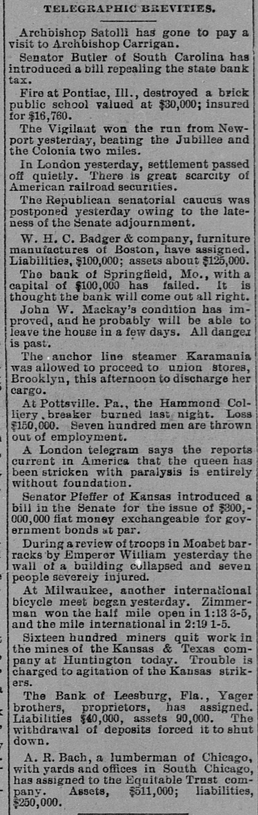 TELEGRAPHIC BREVITIES. Archbishop Satolli has gone to pay a visit to Archbishop Carrigan. Senator Butler of South Carolina has introduced a bill repealing the state bank tax. Fire at Pontiac, III., destroyed a brick public school valued at $30,000; insured for $16,760. The Vigilant won the run from Newport yesterday, beating the Jubillee and the Colonia two miles. In London yesterday, settlement passed off quietly. There is great scarcity of American railroad securities. The Republican senatorial caucus was postponed yesterday owing to the lateness of the Senate adjournment. W. H. C. Badger & company, furniture manufactures of Boston, have assigned. Liabilities, $100,000; assets about $125,000. The bank of Springfield, Mo., with a capital of $100,000 has failed. It is thought the bank will come out all right. John W. Mackay's condition has improved, and he probably will be able to leave the house in a few days. All danges is past. The anchor line steamer Karamania was allowed to proceed to union stores, Brooklyn, this afternoon to discharge her cargo. At Pottsville. Pa., the Hammond Colliery. breaker burned last night. Loss $150,000. Seven hundred men are thrown out of employment. A London telegram says the reports current in America that the queen has been stricken with paralysis is entirely without foundation. Senator Pfeffer of Kansas introduced a bill in the Senate for the issue of $300,000,000 fiat money exchangeable for government bonds at par. During a review of troops in Moabet barracks by Emperor William yesterday the wall of a building collapsed and seven people severely injured. At Milwaukee, another international bicycle meet began yesterday. Zimmerman won the half mile open in 1:13 3-5, and the mile international in 2:19 1-5. Sixteen hundred miners quit work in the mines of the Kansas & Texas company at Huntington today. Trouble is charged to agitation of the Kansas strikers. The Bank of Leesburg, Fla., Yager brothers, proprietors, has assigned. Liabilities $40,000, assets 90,000. The withdrawal of deposits forced it to shut down. A. R. Bach, a lumberman of Chicago, with yards and offices in South Chicago, has assigned to the Equitable Trust company. Assets, $511,000; liabilities, $250,000.