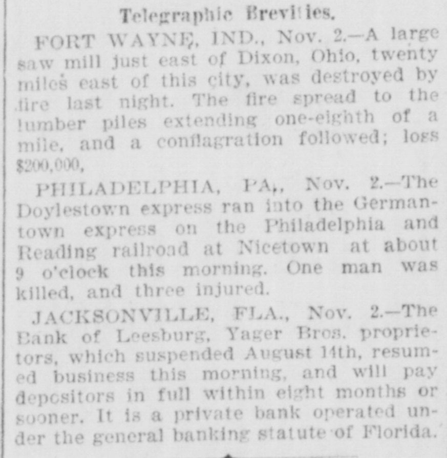 Telegraphic Brevities, FORT WAYNE, IND., Nov. 2.-A large saw mill just east of Dixon, Ohio, twenty miles east of this city, was destroyed by fire last night. The fire spread to the lumber piles extending one-eighth of a mile, and a conflagration followed; loss $200,000, PHILADELPHIA, PA Nov. 2.-The Doylestown express ran into the Germantown express on the Philadelphia and Reading railroad at Nicetown at about 9 o'clock this morning. One man was killed, and three injured. JACKSONVILLE, FLA., Nov. 2.-The Bank of Leesburg, Yager Bros. proprietors, which suspended August 14th, resumed business this morning, and will pay depositors in full within eight months or sooner. It is a private bank operated under the general banking statute of Florida.