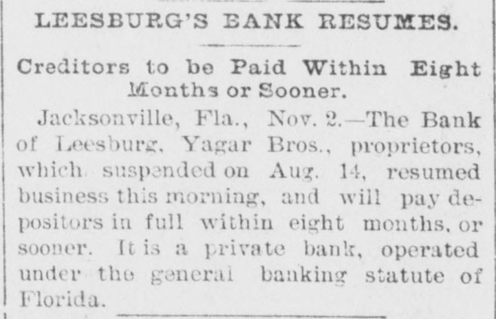 LEESBURG'S BANK RESUMES. Creditors to be Paid Within Eight Months or Sooner. Jacksonville, Fla., Nov. 2.-The Bank of Leesburg. Yagar Bros., proprietors, which suspended on Aug. 14, resumed business this morning, and will pay depositors in full within eight months. or sooner. It is a private bank, operated under the general banking statute of Florida.