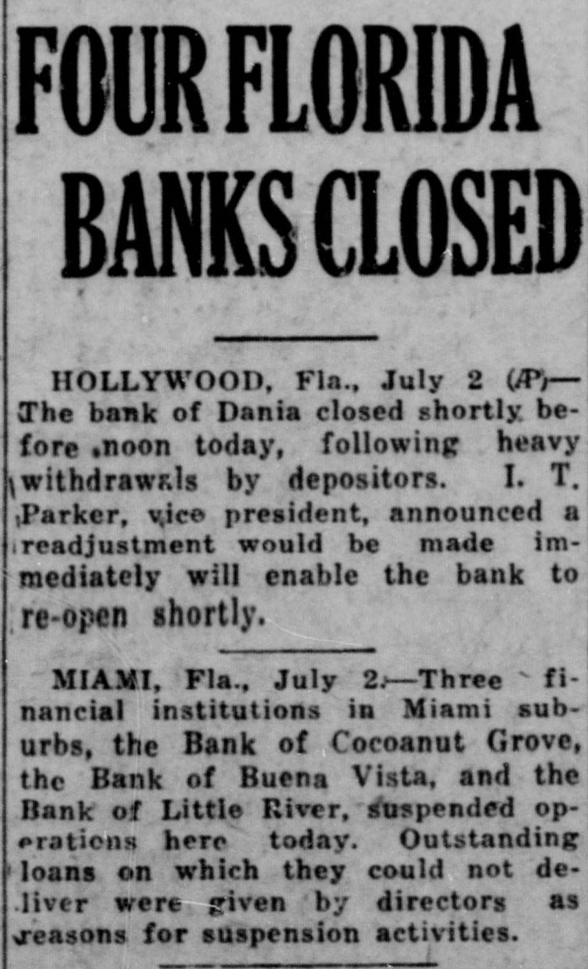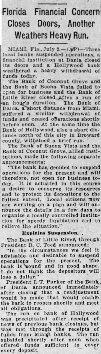 Florida Financial Concern Closes Doors, Another Weathers Heavy Run. local operations, Dania closed and bank heavy withdrawal funds today. The Bank of Coconut Grove and the of Buena failed for the Bank Little River closed run The Bank distance from similar and ceased shortly At the same time the of short disnorth of this city in Broward withstood a brief run. of Buena Vista and the of made the following bank has decided to suspend for the present and will not open for business It is actuated in this course desire its and to protect its depositors to the fullest Local citizens now on nounce the details institution for speedy liquidation and to relieve the situation. of Little River, through B. Teed 'In the we feel advisable and desirable to suspend for the present. The sound and in good shape. do not the depositors will lose a dollar. President T. Parker of the after closing that readjustment would be made that would enable the bank to reopen shortly and meet all The run bank of Hollywood precipitated after receipt of of previous bank closings, but was met through the receipts of funds from banks. The run shortly after noon funds sufficient to every deposit.