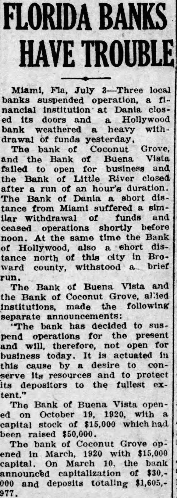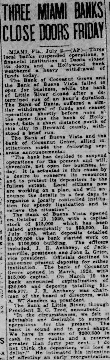 Fla., July Three local banks suspended operations, financial institution Danclosed its doors and bank weathered heavy withdrawof funds today. The Bank of Cocoanut Grove, and the Bank Buena Vista failed open for business and the Bank Little River closed after run hour's duration. The Bank Dania, near Miami suffered similar withdrawal of ceased operations at the same time the Bank of also here, withstood brief The Bank of Buena Vista and the