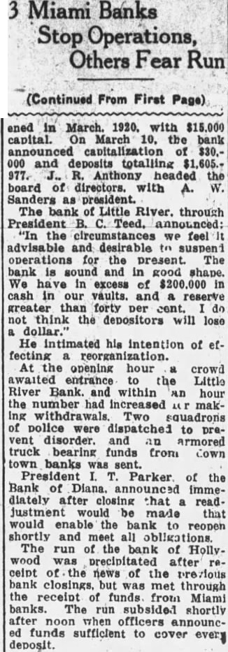 (Continued From First Page) ened in March. 1920. with $15.000 capital. On March 10. the bank announced cabitalization of $30.000 and deposits totalling $1,605.977. R. Anthony headed the board of directors. with A. W. Sanders as president. The bank of Little River. through President B. C. Teed. announced: "In the circumstances we feel It advisable and desirable to suspent operations for the present. The bank is sound and in good shape. We in excess of $200.000 in cash in our vaults. and reserve greater than forty cent. do not think the depositors will lose He intimated his intention of effecting reorganization. At the opening hour crowd awaited entrance to the Little River Bank. and within an hour the number had increased mr makIng withdrawals. Two squadrons of police were dispatched to prevent disorder. and an armored truck bearing funds from Cown town banks was President T. Parker of the Bank of Diana immediately after closing that read. justment made that would enable the bank reopen shortly and meet all obligations The run of the bank of Hollywood was precipitated after receipt of the news of the previous bank closings. but was met through the receipt of funds from Miami banks. The run subsided shortly after when announced funds sufficient to cover every deposit.
