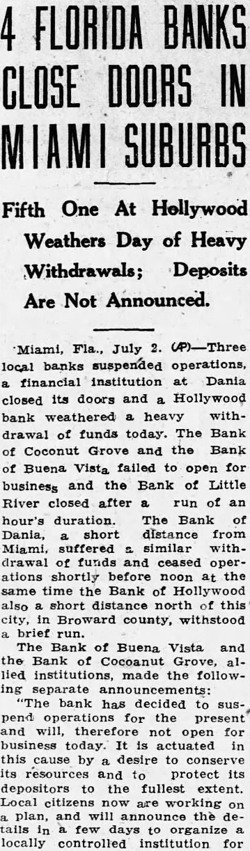 Miami, Fla., July (AP) Three local banks suspended operations, financial institution at Dania closed its doors and Hollywood bank weathered heavy withdrawal of funds yesterday. The Back of Coconut Grove, and the Bank of Buena Vista failed to open for business and the Bank Little River after an hour's duration The Bank of short from Miami withdrawal of suffered funds and ceased operations shortly before noon. At the same time the Bank of Hollywood also short distance north of this city in Broward county, withstood a brief run.