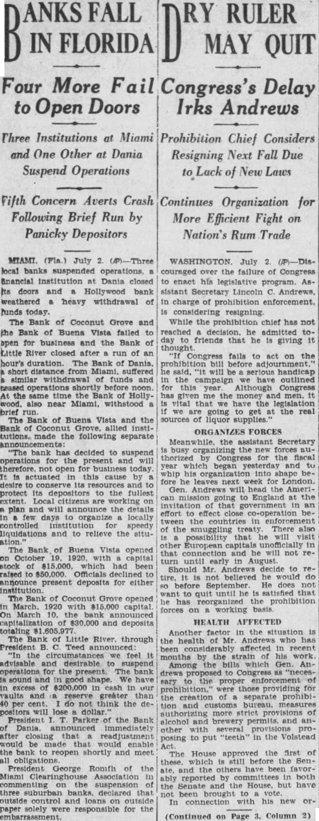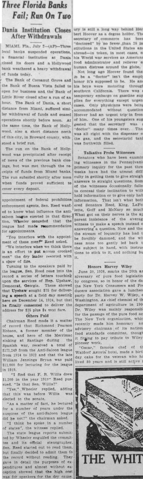 MIAMI. Fla., July 2-(AP)-Three local banks suspended operations, financial institution at Dania closed its doors and Hollywood bank weathered heavy withdrawal of funds today. The Bank of Cocoanut Grove and the Bank of Buena Vista failed to open for business and the Bank of Little River closed after run of an hour. The Bank of Dania, short distance from Miami, suffered simi lar withdrawal of funds and ceased operations shortly before noon. At the same time, the Bank of Holly. wood. also a short distance north of this city, in Broward county. with stood brief run. The run on the Bank of Holly. wood was precipitated after receipt of news of the previous bank closings, but was met through the receipts of funds from Miami banks The run subsided shortly after noon when funds proved sufficient to cover every deposit. appointment of federal prohibition information. That isn't what both. enforcement agents, Sen. Reed want- ered Senators Reed. King. LaFollette, Goff and McNary so much. ed to know what influence the antiWhat got on their nerves is the ap. saloon league exerted in that direcparent insistence of the average tion. Wheeler conceded that the witness to make speech instead of league had made recommendation answering a question. Now and then for appointments. the stream of loquacity has had to "You interfere with the appoint be foreibly dammed, and the witment of these ment" Reed asked. ness none too gently led back to We when we think there the subject in hand, with instrucis an effort to put across crooked tions to stick to it, and nothing but men" the dry leader resorted with it. show fire. Turning to the speakers paid by Honors Harvey Wiley the league, Sen. Reed read into the June 30. 1926, marks the 20th anrecord series of letters touching niversary of pure food legislation upon the services of Rep. Upshaw, by congress, so in honor of the day Democrat. Georgia. These showed the New York Consumers and Prothat Upshaw sought $75 for deliver- ducers luncheon ing a speech at field day meeting party for Dr. Harvey W. Wiley, of here on 14, 1924, but that Washington. As chief chemist of the he finally consented to deliver the department of agriculture in 1906, address for $25 plus $x taxi fare. Dr. Wiley was mainly responsible for the passage of the pure food act. Others Paid The New York organization, which Chairman Reed made it matter recently made him honorary and of record that Richmond Pearson advisory chairman of its national Hobson, former member of the food standards committee, thought house, and hero of the Merrimac it fitting to pay tribute to Wiley's sinking at Santiago during the pioneer work. Spanish war, received total of "Oscar," famous chef of the $171,249 from the Anti-Saloon league Waldorf Astoria hotel, made birth from 1914 to 1922 and that the late day cake for the veteran who has William Jennings Bryan was paid lived 80 years and is still active in $11,000 for lecturing for the league in 1919.