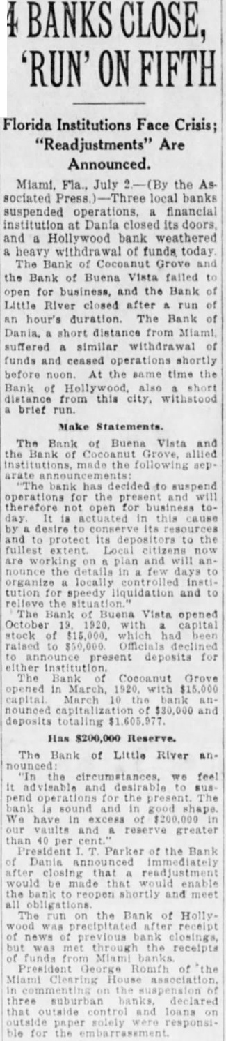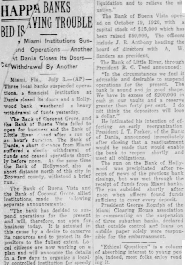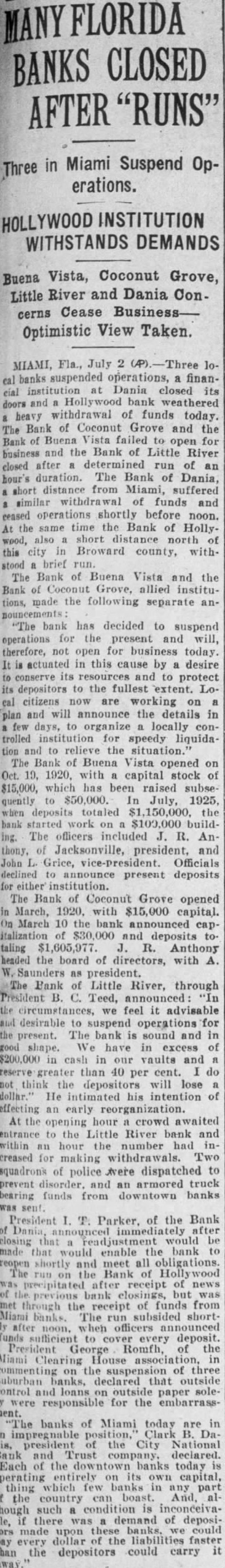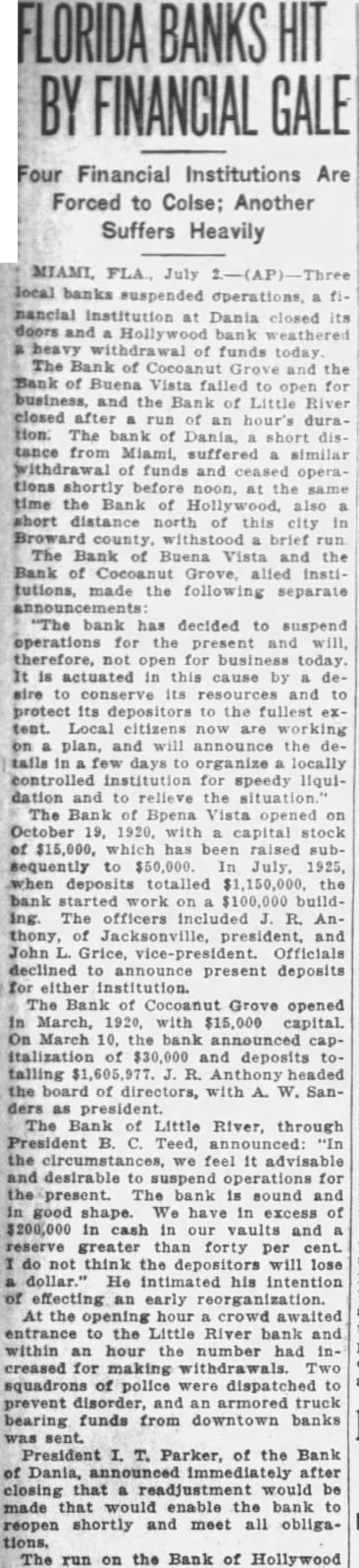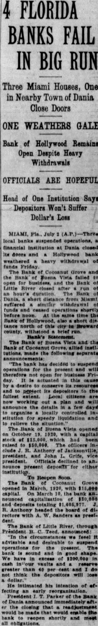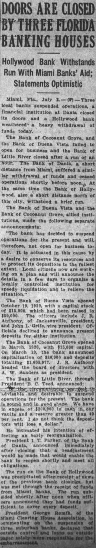 Miami, Fla., July local banks operations, financial at Dania closed its doors and Hollywood bank weathered heavy withdrawal funds today. The Bank of Cocoanut and Grove, the Bank of Buena Vista open for business and the Bank Little River closed after The of short distance from suffered similar withdrawal of funds and ceased shortly before At the same time the Bank of Hollyalso short distance north of this city, withstood brief run. The Bank of Buena Vista and the Bank of Cocoanut Grove, allied institutions, made the following separate "The bank has decided to suspend operations for the present and will, therefore, not open for business day. It actuated in this cause by desire its to protect its to the fullest extent. Local citizens are work. on and will announce the details in few days to organize locally controlled Institution speedy liquidation and to relieve the The Bank of Buena Vista opened October 1920, with capital which had been raised The officers Anthony, of and John Officials announce for The Bank Grove opened with $15,000 On March 10. the $30,000 and deposits Anthony headed board of directors with A. Sanders president. The Bank of Little River through operations the The bank sound excess $200,000 vaults and than 40 the lose He his of Parker, after closing that be made that enable bank reopen shortly and meet all the Bank of was the previous bank was met through receipt of funds from Miami The run sided shortly after noon they had funds ficient cover of suspension three
