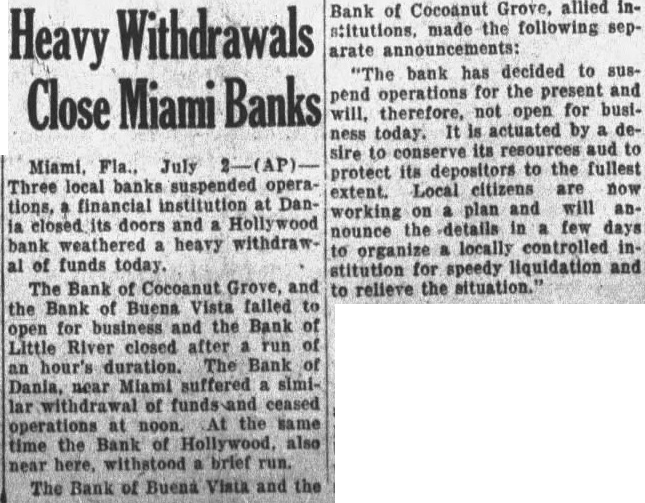 MIAMI, July local suspended operations, financial institution at Dania closed its ered heavy withdrawal of funds toBank of Coconut Grove and the Bank Vista for busines, while the Bank of Little River closed after determined run of an hour's duration. Bank of of funds and shortbefore at the same time the Bank of both a short distance of this city in Broward withstood brief run The Bank of Buena and the Bank of institutions, made the following separate