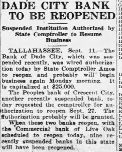 DADE CITY BANK TO BE REOPENED Suspended Institution Authorized by State Comptroller to Resume Business Bank of Dade City, which was suspended recently, was wired authoriza tion today by State Comptroller Amos to reopen and probably will begin business again Monday morning. is capitalized at $25,000. The Peoples bank of Crescent City, another recently suspended bank, day requested the comptroller for thorization to reopen Sept. 27. The probably will be granted. When these two banks reopen, with the Commercial bank of Live Oak scheduled to reopen today, nine recently banks in this state have been reopened.