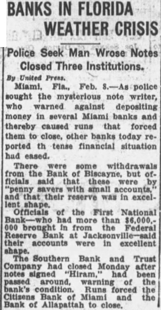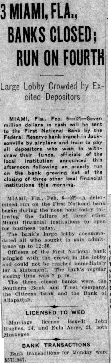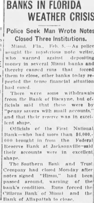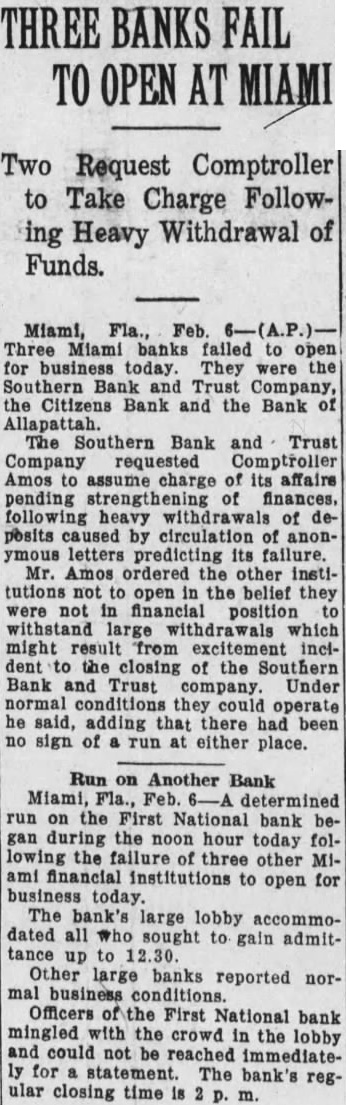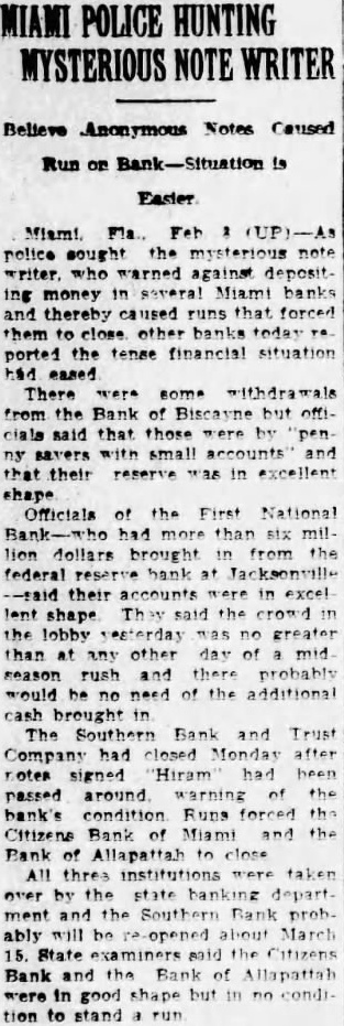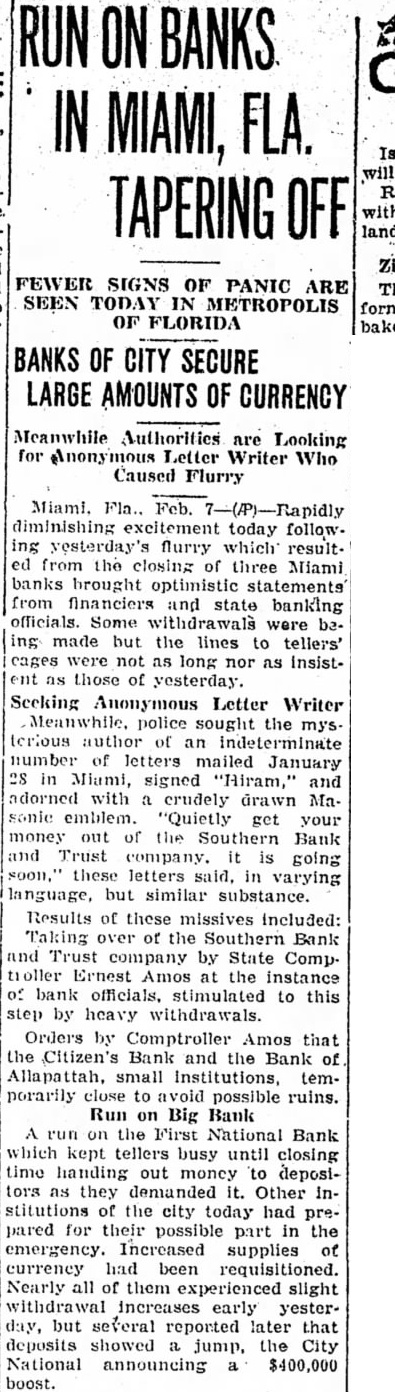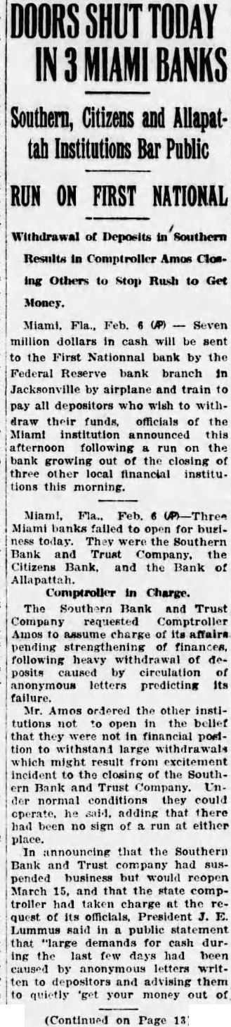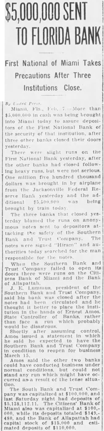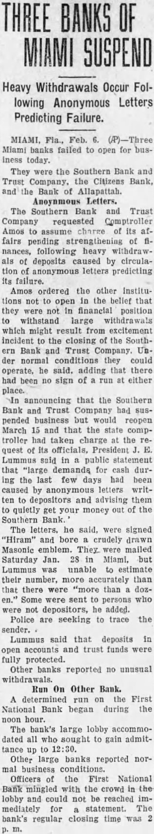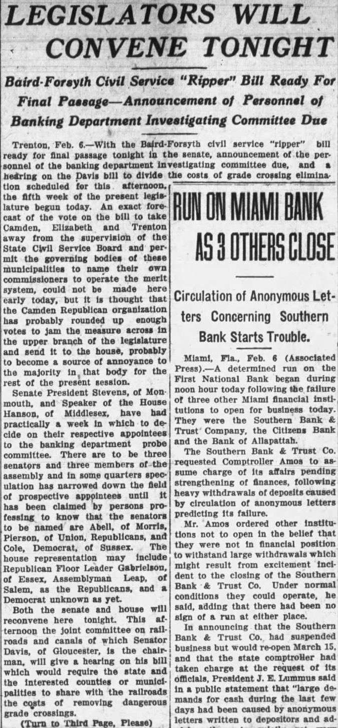 WILL CONVENE TONIGHT Civil Service "Ripper" Bill Ready For Final of Personnel of Banking Department Committee Due Trenton, Feb. the civil service "ripper" bill ready for final passage tonight in the senate, announcement of the personnel of the banking department committee due, and the Davis bill to divide the costs of grade crossing eliminahearing tion for this the fifth week of the present legislature begun today. An exact cast of the vote on the bill to take Camden, Elizabeth and Trenton away from the supervision of the State Civil Service Board and permit the governing bodies of these municipalities to name their own commissioners to operate the merit system, could not be made here Circulation of Anonymous early today, but thought that the Camden Republican organization tersi Concerning Southern has probably rounded up enough votes to jam the measure across in Bank Starts Trouble. the branch of the legislature upper send to the house, probably Miami, Fla., Feb. (Associated to become source of annoyance to determined run on the the majority that body for the First National Bank began during of the present session. noon hour today following the failure Senate President Stevens, of Mon three other Miami financial instimouth, and Speaker of the House tutions to open for business today. Middlesex, have had Hanson, They the Southern Bank practically week in which to deTrust Company, the Citizens Bank cide on their respective appointees and the Bank Allapattah. the banking department probe The Southern Bank Trust Co. committee. There are to be three requested Comptroller Amos to senators and three members sume charge of its affairs pending assembly and in some quarters specstrengthening of finances, following has narrowed down the field ulation heavy of deposits caused prospective appointees until by circulation of anonymous letters has been claimed by persons propredicting its failure. fessing know that the senators Mr. Amos ordered other institube named are Abell, of Morris, tions to in the belief that not open Pierson, of Union, Republicans, and they were in financial position Democrat, Sussex. The Cole, withstand large withdrawals which may include house might result from excitement inciRepublican Floor Leader Gabrielson, dent the closing of the Southern Assemblyman Leap, of Essex, Bank Trust Co. Under normal Salem, the Republicans, and conditions they could operate, he Democrat unknown said, adding that there had been no Both the senate and house will sign of either place. here tonight. This afIn announcing that the Southern ternoon the joint committee on railBank Trust Co. had suspended roads canals which Senator business but would re-open March Davis, of Gloucester, is the chairand that the state had will hearing on his bill taken charge at the request of its which would require the state and officials, President Lummus said the interested counties or municipublic statement that "large palities to share with the railroads mands for cash during the last few the costs of removing dangerous days had been caused by anonymous grade crossings. letters written to depositors and (Turn Third Page, Please)