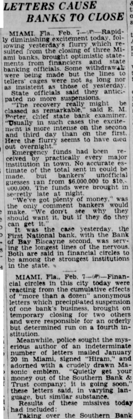 LETTERS CAUSE BANKS TO CLOSE Feb. RapidFla., ly diminishing excitement today. which folyesterday's flurry lowing sulted from the of three Miami banks, brought state- state financiers and ments banking officials. Some withdrawak made but the lines to were being tellers' were not as long nor cages as insistent as those of yesterday State officials said they anticipated no more suspensions. really might be said E. M. as classed Porter chief state bank examiner. "Usually in such cases the excitement more intense on the secona and third day than on the first. Here the flurry seems to have died out funds had been reEmergency ceived by practically every institution town. No accurate timate of the total sent in could be made. but bankers' guesses from 000 to $10. 000,000. The funds were brought in secretly late at night plenty of money was the only comment bankers would they make don't see should want it, but if they do they can get the case yesterday the First National bank. with the Bank Bay Biscayne second. was serving the longest lines of the nervous. Both are said in financial circles to among the strongest institutions in the state. Fla. Feb. cial circles in this city today were reacting from the cumulative effects "more than dozen" anonymous letters which precipitated suspension of one bank's business. brought on temporary closing for two others and were responsible for an orderly but determined run on a fourth institution. Meanwhile, police sought the myserious author of an number of mailed January 20 in Miami, signed "Hiram, and adorned crudely drawn Masonic emblem. "Quietly get your money out of the Southern Bank & Trust company: is going soon," these letters said. in varying language, but similar substance. Results these missives today had included: Taking over the Southern Bank