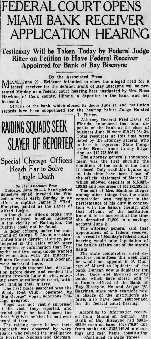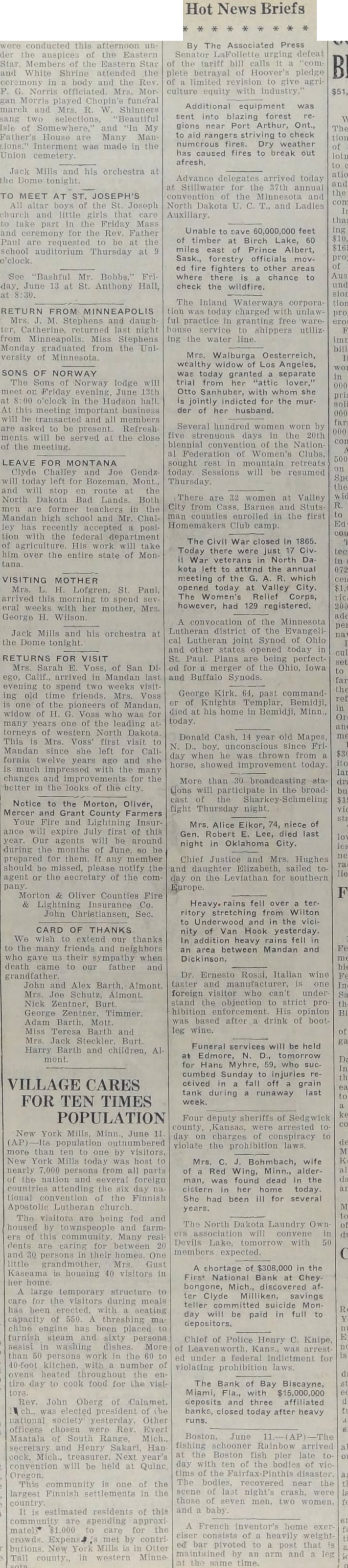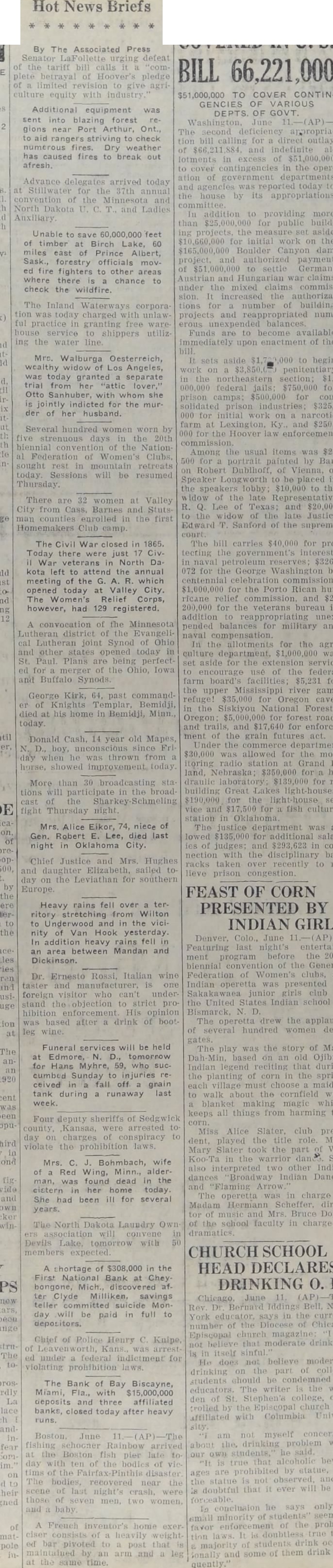Hot News Briefs By The Associated Press LaFollette urging defeat the tariff bill calls plete betrayal Hoover's pledge limited revision give culture equity with industry.' Additional equipment was sent blazing forest gions near Port Arthur, Ont., striving to check numerous Dry weather has caused fires to break out Advance arrived Stillwater the convention the North Dakota Auxiliary. Unable to save feet timber Birch Lake, miles east Prince Albert, Sask., forestry officials ed fire fighters to other where there chance to check the wildfire. The Inland today charged ful practice in house service shippers ing the water Mrs. Walburga Oesterreich, wealthy widow Los Angeles, today granted separate trial from "attic Otto she jointly indicted for the murder of her husband. Several hundred women worn five days the biennial the Nation Federation Clubs, sought rest retreats today. Sessions will be resumed Thursday. There are women at Valley City from Cass Barnes and counties enrolled the first Homemakers Club camp The Civil War closed In 1865. Today there were just War veterans North Da. kota left to attend the annual meeting the which today Valley City, The Relief however, had 129 registered. the Minnesota Lutheran district the Evangelijoint Synod Ohio other opened today St. Paul. Plans are being perfectthe Ohio, Iowa Buffalo Synods. George Kirk, 64, commandof Knights Templar, Bemidji, died his home in Bemidji, Minn., today. Donald Cash, 14 year old Mapes since Fri day when he thrown from showed improvement today More than broadcasting tions participate in the broad the Thursday night. Mrs. Alice Eikor, 74, niece of Gen. Robert Lee, died last night in Oklahoma City. Chief Justice and Mrs. Hughes daughter Elizabeth, sailed toon the Leviathan for southern Europe. fell over territory stretching from Wilton to Underwood and the nity Van Hook yesterday. In addition heavy rains fell area between Mandan and Dickinson. Dr. Ernesto Rossi, Italian wine taster manufacturer, foreign visitor who under stand objection strict pro hibition enforcement. His opinion based after drink bootleg wine. Funeral services be held Edmore, tomorrow for Hans Myhre, 59, who succumbed Sunday injuries ceived fall off grain tank during runaway last week. Four deputy sheriffs of Sedgwick county Kansas, arrested day charges of violate the prohibition Mrs. C. Bohmbach, wife Red Wing, Minn., alderman, found dead the cistern her home today. She been ill for several years. North Dakota Laundry Own convene Devils Lake, with expected. shortage of $308,000 the First National Bank at Chey. bongone, Mich., Clyde Milliken, savings teller committed Monday will be paid in full to depositors. Chief of Police Henry C. Knipe, Kans., arrest under federal for violating prohibition laws. The Bank of Bay Biscayne, Miami, with $15,000,000 deposits and three affiliated banks, closed today after heavy runs. June fishing schooner Rainbow arrived Boston fish day with of the bodies of the disaster The bodies, recovered scene last night's those seven men, two women, and baby French inventor's home heavily bar pivoted to that an arm and same time.