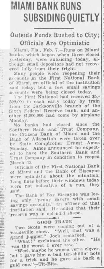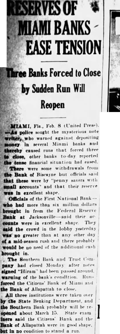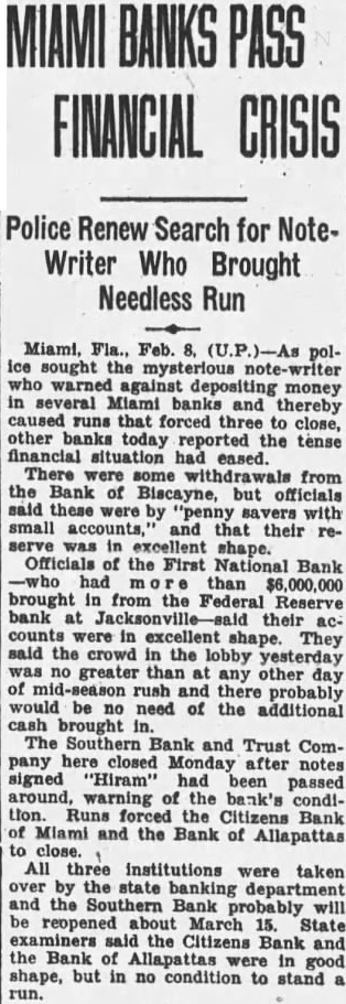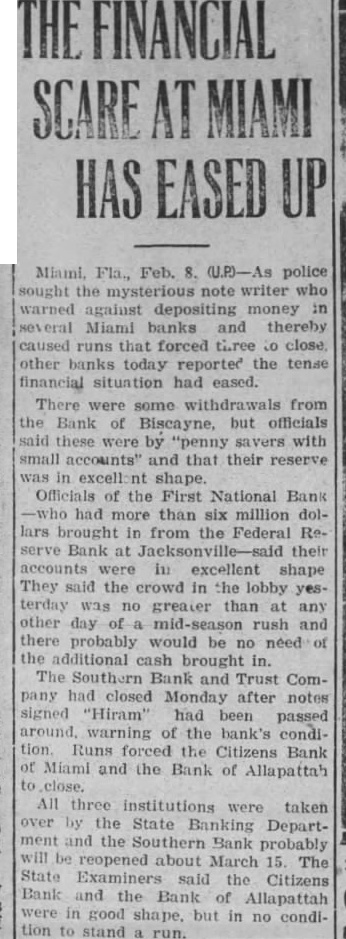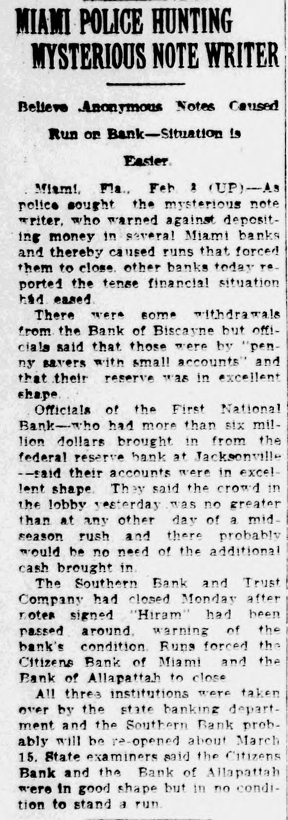 MIAMI POLICE HUNTING MYSTERIOUS NOTE WRITER Believe Anonymous Notes Caused Run or Bank-Situation is Easter Miami, Fla., Feb 2 (UP)-As police sought the mysterious note writer, who warned against depositing money in several Miami banks and thereby caused runs that forced them to close. other banks today reporte1 the tense financial situation had eased There were some withdrawals from the Bank of Biscayne but officials said that those were by "penny savers with small accounts and that their reserve was in excellent shape Officials of the First National Bank-who had more than six million dollars brought in from the federal reserve bank at Jacksonville --said their accounts were in excellent shape They said the crowd in the lobby yesterday was no greater than at any other day of a midseason rush and there probably would be no need of the additional cash brought in The Southern Bank and Trust Company had closed Monday after notes signed "Hiram" had been passed around. warning of the bank's condition. Runs forced the Citizens Bank of Miami and the Bank of Allapattah to close All three institutions were taken over by the state banking department and the Southern Bank probably will be re-opened about March 15. State examiners said the Citizens Bank and the Bank of Allapattah were in good shape but in no condition to stand a run
