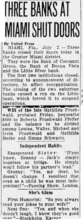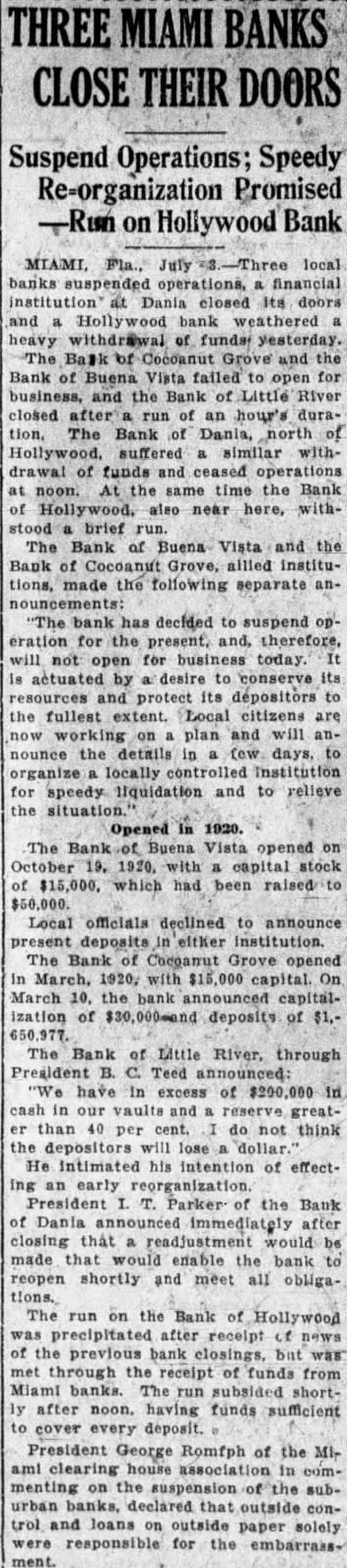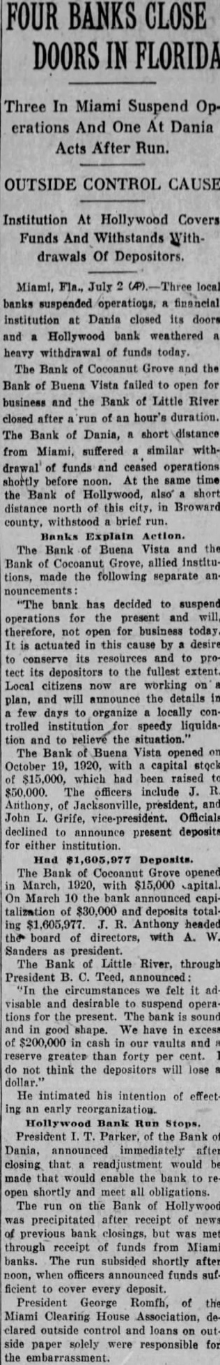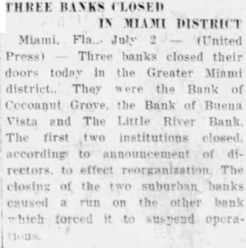 Three Miami, Fla., financial institutions, the Bank of Cocoanut Grove, the Bank of Buena Vista and the Bank of Little River suspended operations last week. The outstanding loans on which they could not deliver were given by directors as reasons for suspension of activities All Poland, and particularly Warsaw celebrated Independence Day in a gorgeous manner, according to reports from that city. Red. white and blue bunting and the Stars and Stripes are everywhere. Radio legislation went by the boards in the closing session of Congress last week when a last-minute attempt to provide a stop-gap measure until the next session of Congress failed. William C. Carter, foreman of the Los Angeles County Gra Jury. few days ago announced that the of fer of Aimee Semple McPherson, evangelist. made through her mother. Mrs. Minnie Kennedy, to appear voluntarily before the inquistorial body, would be "promptly accepted.' A report from Easton, Penn., says that the proposed $40,000,000 Portland Cement consolidation. the formation of which has been under way for some time, will be completed over the week-end. A government "wine list" with accompanying "prices," not dissimilar to the old reverseside of the oldtime hotel menu, will be used as a schedule of fines for the violation of the Volstead Law on ocean steamers, the customs searching squad of New York City announced recently. An appeal for elemency was telegraphed recently to the President of the United States. by Charles Ponzi, convicted Boston swindler, being held in Houston, Texas. Ponzi is wanted by the Massachusetts authorities. The Shipping Board and the Department of Commerce were recently directed to conduct a joint investigation and submit plans to the Senate on January 1 for maintenance of a permanent and efficient merchant marine under a Senate Resolution So crowded with men arrested for drunkenness was the city jail of Minneapolis recently, that twelve of those who showed the most beneficial effects of a night behind the bars were released Tuesday on $15 bail to make room for others. A five-acre landscaped cemetery for pet animals. from mice to elephants. is planned by Michael J.