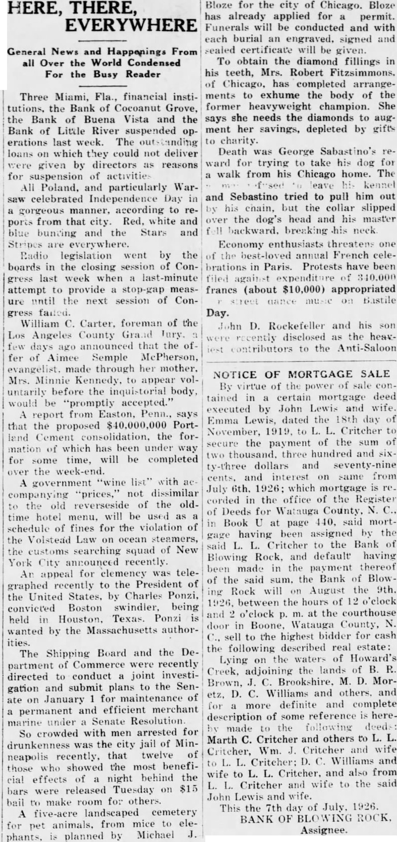 NOTICE OF MORTGAGE SALE By virtue of the power of sale contained in a certain mortgage deed executed by John Lewis and wife. Emma Lewis, dated the 18th day of November, 1919. to L. L. Critcher to secure the payment of the sum of two thousand. three hundred and sixty-three dollars and seventy-nine cents, and interest on same from July 6th. 1926; which mortgage is re. corded in the office of the Register of Deeds for Watauga County, N. C., in Book U at page 140, said mortgage having been assigned by the said L. L. Critcher to the Bank of Blowing Rock. and default having been made in the payment thereof of the said sum. the Bank of Blowing Rock will on August the 9th. 1926. between the hours of 12 o'clock and 2 o'clock p. m. at the courthouse door in Boone, Watauga County, N. C., sell to the highest bidder for cash the following described real estate: Lying on the waters of Howard's Creek, adjoining the lands of B. R. Brown, J. C. Brookshire. M. D. Moretz, D. C. Williams and others. and for a more definite and complete description of some reference is hereby made to the following deeds: Marth C. Critcher and others to L. L. Critcher, Wm. J. Critcher and wife to L. L. Critcher: D. C. Williams and wife to L. L. Critcher, and also from L. L. Critcher and wife to the said John Lewis and wife. This the 7th day of July. 1926. BANK OF BLOWING ROCK. Assignee.