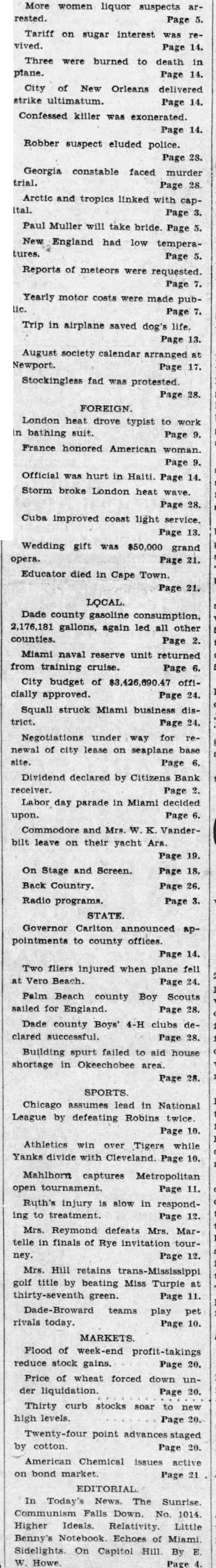 More women liquor suspects Page Tariff on sugar interest vived. Page Three were burned to death plane. Page delivered Page Page Georgia constable faced murder trial. Page Arctic and tropics linked with capital. Page Paul Muller will take bride. Page Wedding gift was $50,000 grand opera. Page Educator died in Cape Town. Squall struck Miami business trict. Page Negotiations under for newal city lease on seaplane base site. Page Dividend declared by Citizens Bank receiver. Page Labor day parade in Miami decided upon. Page Commodore and Vanderbilt leave on their yacht Back Country. Page On Stage and Screen. Page Page Radio programs. Page STATE. Governor Carlton announced pointments to county offices. Page Two fliers injured when plane fell Beach. Page Palm Beach county Boy Scouts sailed for England. Page Dade county Boys' clubs clared successful. Page Building spurt failed to aid house shortage Okeechobee area. Page Chicago assumes lead in National League defeating Robins twice. Page Athletics Tigers while Yanks divide with Cleveland. Mahlhorn captures Metropolitan open tournament. Page Ruth's injury slow in ing to treatment. Page 12. Mrs. Reymond defeats Mrs. Martelle finals of Rye invitation tourney. Page Mrs. Hill retains golf title by beating Miss Turpie green. Page Dade-Broward teams play rivals today. MARKETS. Flood reduce stock gains. Page Price wheat forced down der liquidation. Page Thirty curb stocks soar levels. point by cotton. Page American Chemical issues active bond Page EDITORIAL In News. The Communism Falls Down. No. 1014. Higher Ideals. Relativity. Little Benny's Echoes Miami. Sidelights. Capitol