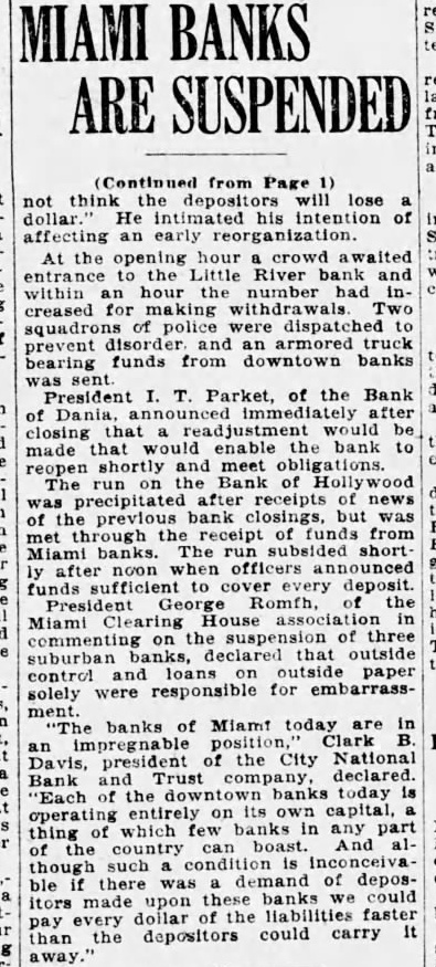 MIAMI BANKS ARE SUSPENDED (Continued from Page not lose He intimated his intention early At the opening hour crowd awaited to the Little River and within number had creased for squadrons police dispatched to prevent an armored truck bearing funds downtown banks was President Parket, of the Bank that would made that bank meet The Bank was precipitated the previous bank closings, but receipt of funds from met short officers announced deposit. of the Miami the suburban declared that outside loans paper control solely were responsible for embarrassbanks of are in of the City National Davis, president Trust declared. Bank the today "Each its capital, which few part country though of deposble dollar of the liabilities faster pay the depositors could carry than