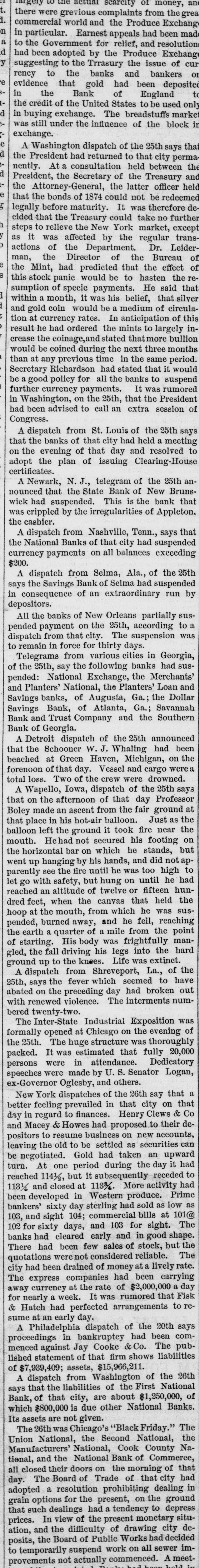 largery to the actual scarcity of money, an were from d. world and the n in Earnest appeals commercial there particular. grevious complaints Produce had been Exchange the mad grea a to the Government for relief, and resolution d been by the y to the Trrasury cur suggesting had adopted Produce the issue Exchange of to the banks and or e that gold had been deposited to evidence in rency the Bank of England bankers the credit of the United States to be used only d in buying exchange. The breadstuffs market was still under the influence of the block in exchange. d A Washington dispatch of the 25th says that the President had returned to that city permaAt a consultation held between the the of the and the the President, nently. Attorney-General, Secretary latter Treasury be officer redeemed held of 1874 could not before maturity. It was dethe could no cided legally that the that bonds Treasury take market, therefore further except steps to relieve the New York as it was affected by the regular trans actions of the Department. Dr. Leiderman, the Director of the Bureau of the Mint, had predicted that the effect of this stock panic would be to hasten the sumption of specie payments. He said that within a month, it was his belief, that silver and gold coin would be a medium of circulaat rates. In had ordered the mints to result tion he currency anticipation largely of this increase the coinage,a thatmore bullion would be coined during the next three months than at any previous time in the same period. Secretary Richardson had stated that it would for all the banks to suspend payments. be further good currency policy the was President rumored in Washington, on the 25th, that had been advised to call an extra session of Congress. A dispatch from St. Louis of the 25th says that the banks of that city had held a meeting on the evening of that day and resolved to adopt the plan of issuing Clearing-House certificates. A Newark, N. J., telegram of the 25th nounced that the State Bank of New Brunswick had suspended. This is the bank that was crippled by the irregularities of Appleton, the cashier. A dispatch from Nashville, Tenn., says that the National Banks of that city had suspended currency payments on all balances exceeding $200. A dispatch from Selma, Ala., of the 25th the Bank of Selma suspended of an run by says in consequence Savings extraordinary had depositors. All the banks of New Orleans partially suspended payment on the 25th, according to dispatch from that city. The suspension was to remain in force for thirty days. Telegrams from various cities in Georgia, of the 25th, say the following banks had susNational Exchange, the Merchants' National, the pended: and Planters' Planters' the Loan Savings banks, of Augusta, Ga.; Dollar Savings Bank, of Atlanta, Ga.; Savannah Bank and Trust Company and the Southern Bank of Georgia. Detroit dispatch of the 25th announced Schooner W. J. been at Green Haven, on the beached that A the Whaling Michigan, had forenoon of that day. Vessel and cargo were a total loss. Two of the crew were drowned. A Wapello, Iowa, dispatch of the 25th says that on the afternoon of that day Professor Boley made an ascent from the fair ground that place in his hot-air balloon. Just as the left the ground it took He had not secured on bar on which mouth. balloon the horizontal he his fire stands, footing did near not but the hanging by his hands, and see the fire until he was too to but hung on parently went let go up with safety, until high he hun- had an altitude of twelve or fifteen when the canvas at the mouth, from which hoop dred reached feet, that fell, he held was reaching sus- the pended, burned away, and he the earth a quarter of a mile from the point of starting. His body was frightfully man- hard gled, the fall driving his legs into the ground up to the knees. Life was extinct. A dispatch from Shreveport, La., of the 25th, says the fever which seemed to have abated on the preceding day had broken out with renewed violence. The interments numbered twenty-two. Inter-State Industrial Exposition was opened at Chicago on of formally The the thoroughly evening the 25th. The huge structure was 20,000 It was estimated that fully were in attendance. were made by U. S. persons packed. speeches others. Senator Dedicatory Logan, ex-Governor Oglesby, and New York dispatches of the 26th say that better feeling prevailed in that city on that in to finances. Henry Clews & Co and & Howes had proposed to day Macey regard accounts, their deto resume business on new the old to be settled as positors leaving securities upward can be negotiated. Gold had taken an turn. At one period during the day it had but it subsequently receded and closed at 113% More in Western as reached been 1131/2014 developed 1141/2, produce. activity low Prime had day sterling had sold as sight 104; commercial days, and 103 for bankers' 102 103, for and sixty sixty bills sight. at shape. 101@ The banks had cleared early and in good There had been few sales of stock, but the quotations were not considered reliable. The city had been drained of money at a lively rate The express companies had been carrying away currency at the rate of $2,000,000 day for nearly a week. It was rumored that Fisk & Hatch had perfected arrangements to resume at an early day. A Philadelphia dispatch of the 20th says in bankruptcy had been comJay Cooke of that firm lished proceedings menced statement against & Co. shows The liabilities pubof $7,939,409; assets, $15,966,211. from 26th liabilities of the National A dispatch that the Washington First of the Bank, says of that city, are about $1,250,000, of which $800,000 is due other National Banks. Its assets are not given. 26th was Chicago's Friday." The the Second the National, Cook NaManufacturers' Union The National, of National, County Commerce, tional, and the National Bank all closed their doors on the morning of that day. The Board of Trade of that city had adopted a resolution pr
