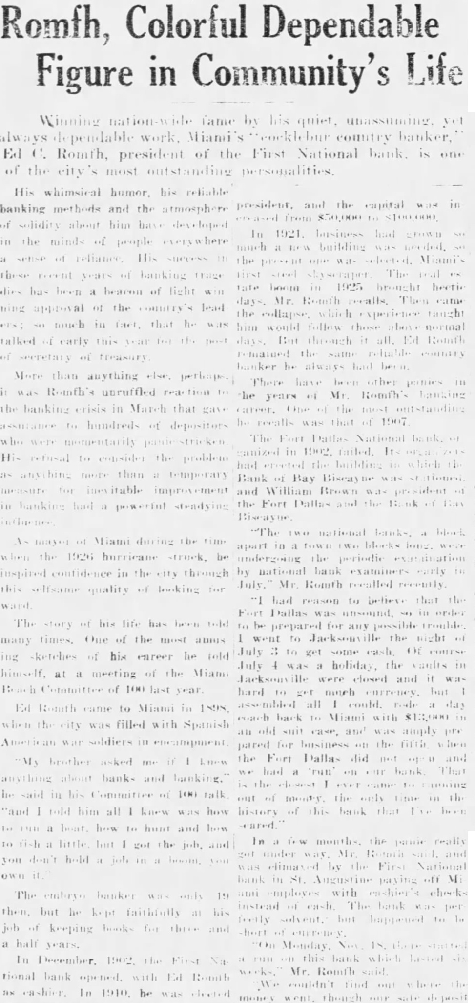 Romfh, Colorful Dependable Figure in Community's Life Winning nation-wide fame by his quiet, unassuming, yet always pendable work. Miami's "eocklebur country banker, Ed C. Romfh, president of the First National bank. is one of the city's most outstanding personalities. His whimsical humor. his reliable banking methods and the atmosphere of solidity about him have developed in the minds of people everywhere a sense of reliance. His sureess these recent years of banking this dies has been a beacon of light will ming approval of the country's lead talked of early this year 101 the post of secretary of treasury More than anything else, perhaps. it was Romfh's unruffled reaction to His refusal to consider the problem as anything more than : temporary measure for inevitable improvement ⑉ banking had a powerful steadying influence 1. mayor of Miami during the time when the 1926 hurricane struck. be inspired confidence in the city through this selfsame quality of looking for The story of his life has been Told many times. One of the most abous ing sketches of his eareer he told himself, at a meeting of the Miami Beach Committee of 100 last year. Ed Romth came to Miami in 1898. when the city was filled with Spanish "My brother asked me if knew anything about banks and banking. he said in his Committee of 100 talk "and told him all knew was how to THE a boat. how to hunt and how to fish a little but I got the job. and The embryo banker was only 19 then, but he kept faithfully an his job of keeping books for three and a half years. In December. 1902. the First Na tional bank opened. with Ed Ronth president, and the capital was in In 1921. business had grown much a new building was needed. the present one was selected, Miami's late boom in 1925 brought heetic days. Mr. Romth recalls, Then came the collapse, which experience taught him would follow those above normal days. But through it all. Ed Romth remained the same reliable country banker he always had been. Phere have been other patries 111 the of Mr. banking years 1907 The Fort Dallas National bank. had erected the building in which Bank of Bay Biseayne was " tioned and William Brown was president +1 the Fort Dallas and the Bank of Ban "The TWO national lanks. block apart in a town TWo blocks long. were undergoing the periodic examination by national bank examiners early in "I had reason to believe that the to be prepared for any possible trouble went to Jacksonville the night of July was a holiday, the vaults in Jacksonville were closed and it was hard to get much enrrency. but assembled all I could. rede a day each back To Miami with $13,000 111 pared for business on the fifth when we had a 'run on our bank That history of this bank that Eye been was elimaxed by the First National bank in St. Augustine paying off Mi instead of eash. The bank Was per We couldn't find here the