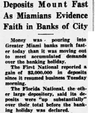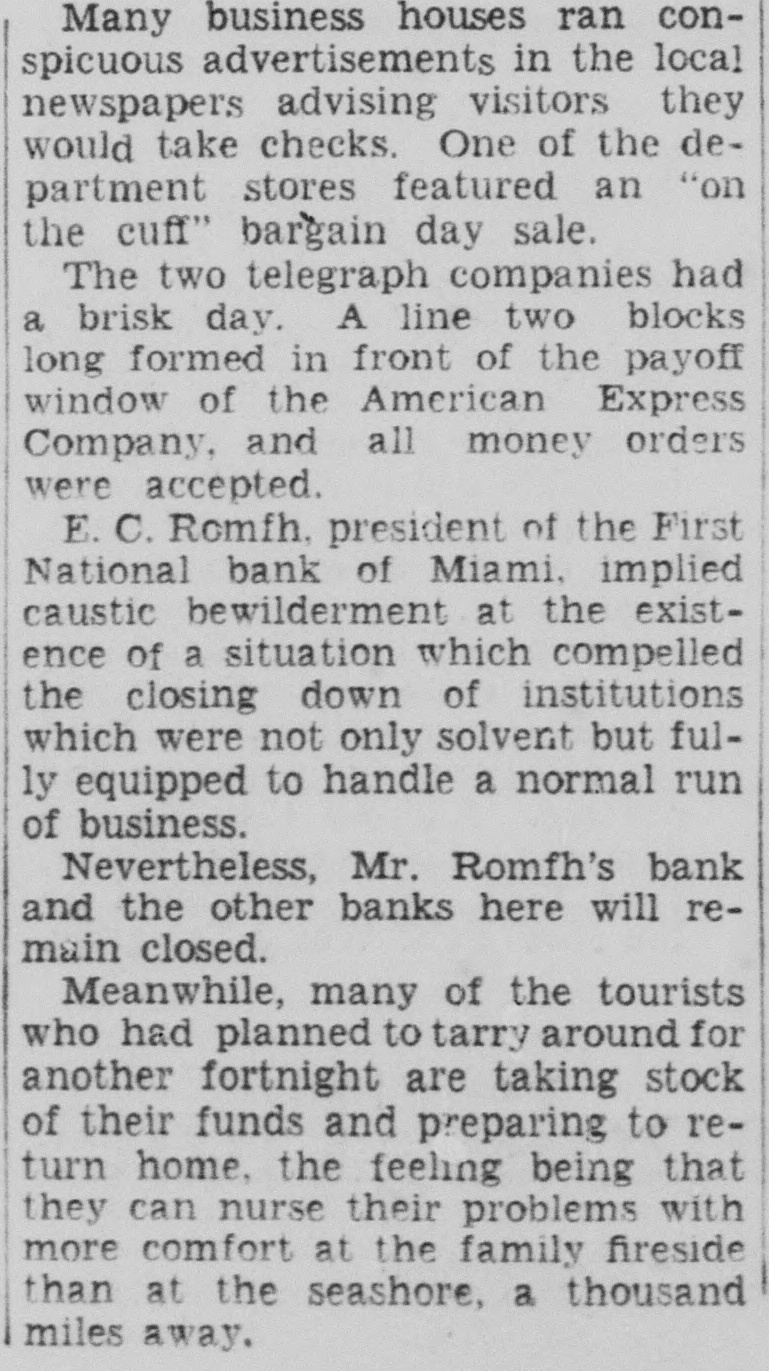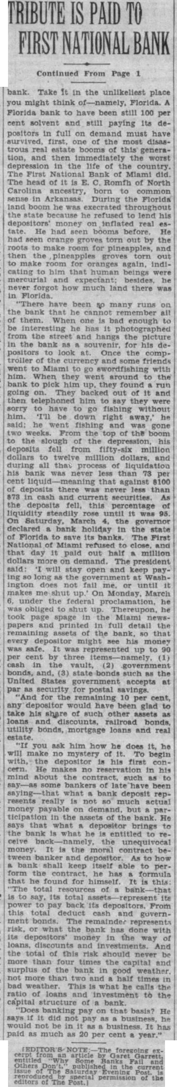 Florida came into the national eye for some very favorable nancial publicity last week when Garet Garrett, economist for The Saturday Evening Post, paid high tribute to Romfh of the First National Bank Miami. Declaring that "there are only two reasons why bank fails: judgment and character." Mr. Garrett also said: "There are only two reasons bank does not fail: again, judgment and character." But read Mr. Garrett's story Miami's Banker Romfh and how he operates bank for the benefit the depositor, told in The Saturday Evening Post: the case of an exceptionbank. Take in the unlikeliest place you might think Florida. Florida bank to have been still 100 per cent solvent and paying its depositors in full demand must have survived, first, one of the most disastrous real estate booms of this generation, and then immediately the worst depression in the life of the country. The First National of ami did. The head of it Romfh, of North Carolina ancestry, born common sense in Arkansas. During the Florida land boom throughout the state because he refused to lend his positors' money inflated real He had seen booms before. He had seen groves torn orange the roots to make room pineapples, and then the pineapple groves torn out to make room for oranges again, indicating to him that human beings were mercurial and expectant; besides, he never forgot how much land there Florida. "There have been so many runs his bank that he cannot remember all of them. When one bad enough to be interesting, he has photographed from the street and hangs the picture in the bank souvenir, for his depositors at. Once the Comptroller of the Currency and some friends to Miami to swordfishing him. When they went around the bank to pick him up, they found going They backed of and then telephoned to say they were sorry have to go fishing without him. be down right said; went fishing and was gone two weeks. From the top of the boom the slough of depression, his deposits fell from million dollars to twelve million dollars, during all that process of liquidation his bank was never less than per cent that against of deposits there less than $73 in cash and current securities. As the deposits fell, this percentage of liquidity steadily rose until 95. On Saturday, March fourth, the declared bank holiday the state of Florida to save its banks. The First National of Miami refused to close, and that day out half million dollars more demand. The president said: stay open and keep paying long the Government Washington does not fail me, or until makes me shut On Monday, March sixth, under the Federal proclamation, he was obliged shut up. Thereupon he took page space in the Miami newspapers and printed in full detail the ing assets of the bank, that every depositor might his money was safe. was representup to 90 per cent by three items -namely, in the vault, (2) Government bonds, and, (3) state bonds such as the United States Government accepts at par security for postal savings. for the remaining 10 per cent, any depositor would have been glad to take his share of such other assets loans and discounts, railroad bonds, utility bonds, mortgage loans and real estate. you ask him how he does will make no mystery of begin with, the depositor first concern. He makes no reservation in his mind about the contract, such as some bankers of late have been saying what bank deposit sents really is not much actual money payable on demand, but participation in the assets of the bank. He says that what deposibrings to the bank what entitled to receive the unequivocal money. the moral contract between banker and depositor. As to how bank shall keep itself able to perform the contract, he has formula that he found for himself. It is this: The total resources of to say, its total its power to pay back its depositors. From this total deduct cash and Government bonds. The mainder represents risk, or what the bank has done with its depositors' money in the way of loans, discounts and investments. And the total of this risk should never be more than four times the capital and surplus of the bank in good weather, not more than two and half times in bad weather. This what he calls the ratio of loans and investments to the capital structure of bank.