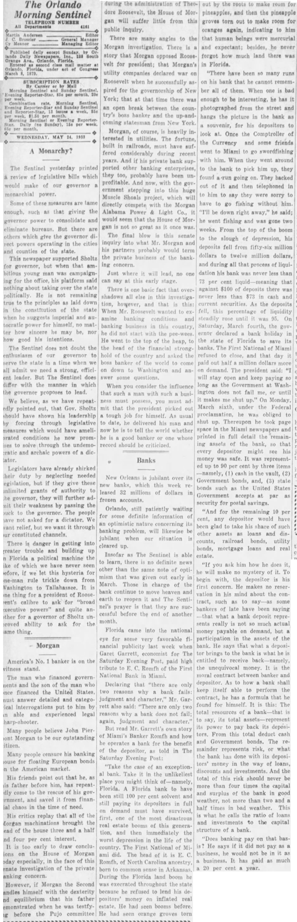 New Orleans jubilant over banks, which this week leased 32 millions of dollars frozen accounts. Orlando, still patiently waiting for some definite information an optimistic nature concerning banking problem, will likewise jubilant when our situation cleared up. Insofar The Sentinel to learn, there no definite news other than the same note of mism that was given out early March. Those in charge of the bank continue to move heaven and earth to reopen and The nel's prayer that they are cessful before the end of another month.