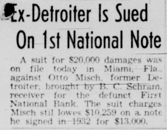 Ex-Detroiter Is Sued On 1st National Note A suit for $20,000 damages was on file today in Miami, Fla., against Otto Misch, former Detroiter; brought by B. C. Schram. receiver for the defunct First National Bank. The suit charges Misch stil lowes $10,259 on a. note he signed in 1932 for $13,000.