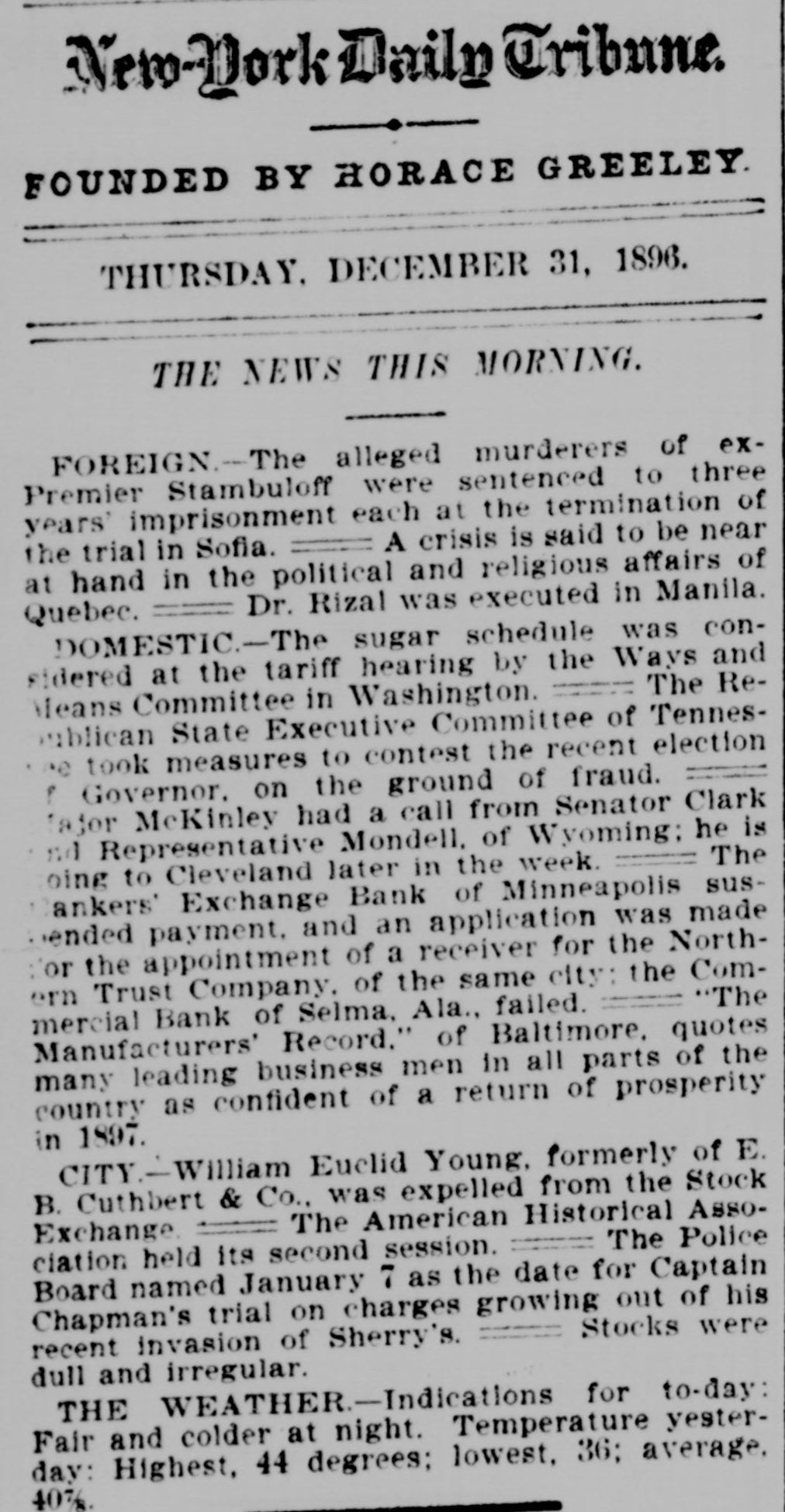 New-York Daily Tribune. FOUNDED BY HORACE GREELEY THURSDAY, DECEMBER 31, 1896. THE NEWS THIS MORNING. FOREIGN.-The -- alleged murderers of exPremier Stambuloff were sentenced to three years' imprisonment each at the termination of A crisis is said to be near the trial in Sofia. at hand in the political and religious affairs of Dr. Rizal was executed in Manila. Quebec. DOMESTIC.-The sugar schedule was considered at the tariff hearing by the Ways and The ReMeans Committee in Washington. publican State Executive Committee of Tennese took measures to contest the recent election Governor. on the ground of fraud. ? lajor McKinley had a call from Senator Clark nd Representative Mondell, of Wyoming; he is The oing to Cleveland later in the week. ankers' Exchange Bank of Minneapolis susended payment. and an application was made or the appointment of a receiver for the Northern Trust Company. of the same city: the Com"The Bank of Selma, Ala., failed. mercial Manufacturers' Record." of Baltimore, quotes many leading business men in all parts of the country as confident of a return of prosperity in 1897. CITY.-William Euclid Young, formerly of E. B. Cuthbert & Co., was expelled from the Stock The American Historical AssoExchange The Police ciation held its second session. Board named January 7 as the date for Captain Chapman's trial on charges growing out of his Stocks were recent invasion of Sherry's. dull and irregular. THE WEATHER.-Indications for to-day: Fair and colder at night. Temperature yesterday: Highest, 44 degrees; lowest, 36; average. 40%