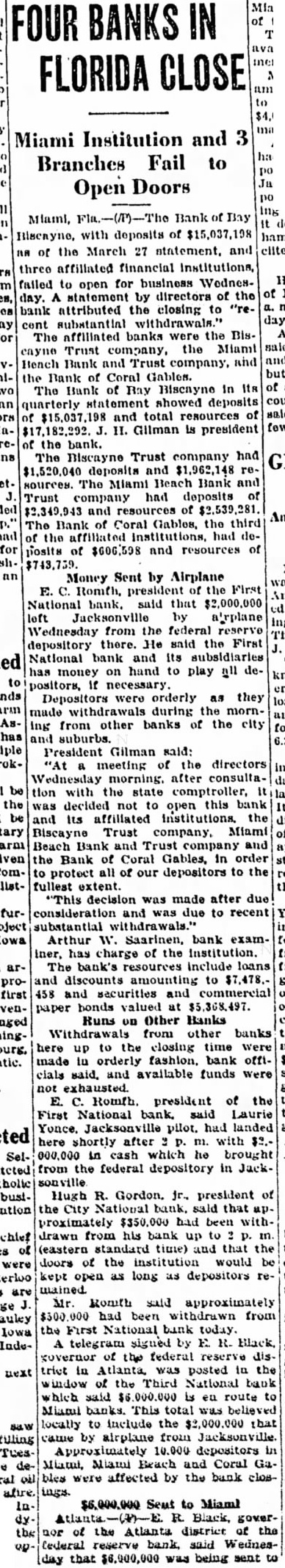 Seventh Florida Bank Shuts Down Sanford National Latest to Close In Eight Days-Situation Causing Runs. the failure of the seventh bank in the state within eight days in the collapse of the First National bank, of Sanford, businessmen expressed the opinion today that Florida's smaller cities face the most serious financial crisis in years. The bank was forty years old. the oldest in Seminole county. The run on the Sanford bank was caused by the failure of four banks in the neighboring towns, which bred uneasiness. Runs on banks throughout the north, east and central parts of the state are beginning as the news spreads of the successive failures. The failure of the seven banks has tied up deposits totaling $10,000,000 and has affected approximately 5,000 depositors. The trouble started with the fail. ure of the People's bank. of Jacksonville, eight days ago. This failure was attributed to dissension and dispute among the stockholders here and group of Northern capitallsts, who own a large amount of the stock. There some mystery as to why the Miami Bank and Trust company closed Thursday. The closing that bank did not affect the other institutions in the area as did the People's bank failure 'at Jacksonville. The Miami Bank and Trust company was regarded as on "outside institution' by the other banks of the community.