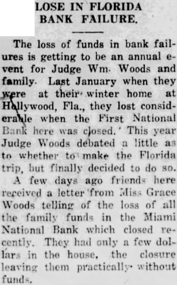 LOSE IN FLORIDA BANK FAILURE. The loss of funds in bank failures is getting to be an annual vent for Judge Wm. Woods and family. Last January when they were at their winter home at Hallywood, Fla., they lost considerable when the First National Bank here was closed. This year Judge Woods debated little as to whether the Florida trip, but finally decided to do SO. A few days ago friends here received letter from Miss Grace Woods telling of the loss of all the family funds in the Miami National Bank which closed recently. They had only a few dollars in the house, the closure leaving them practically- without funds.