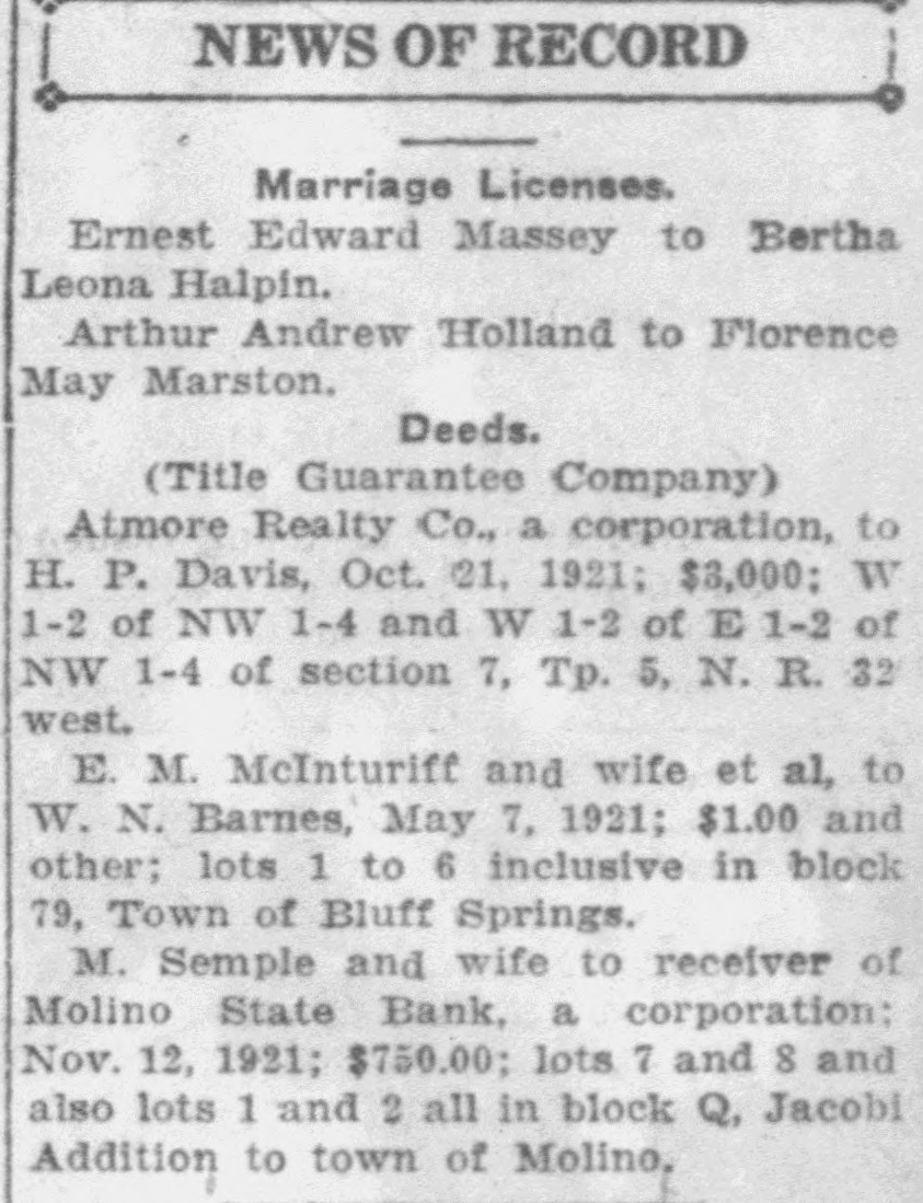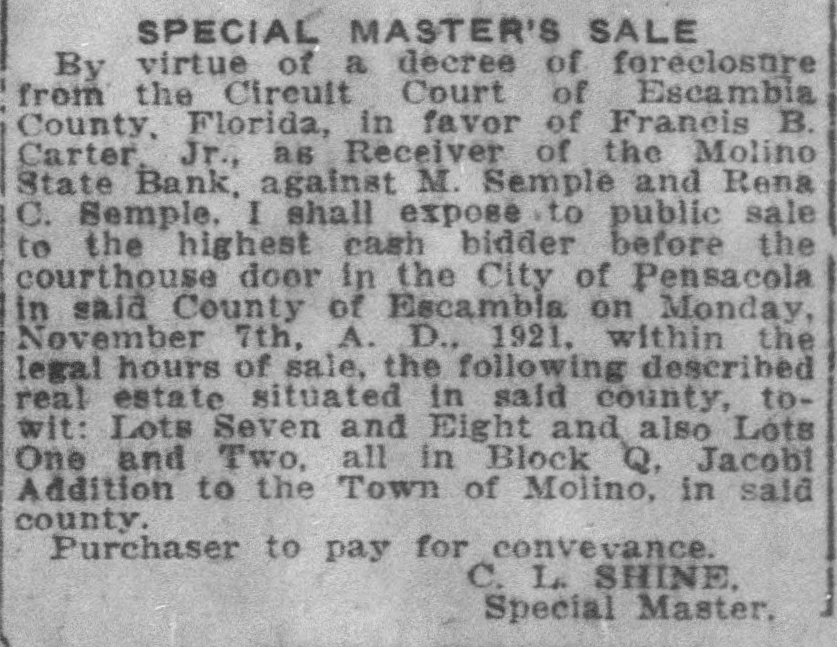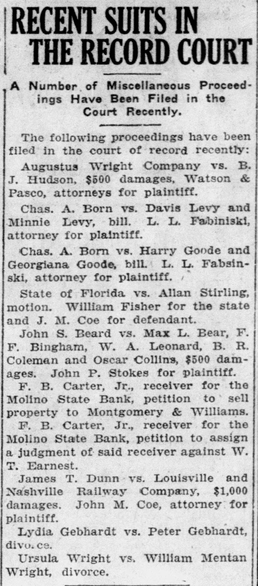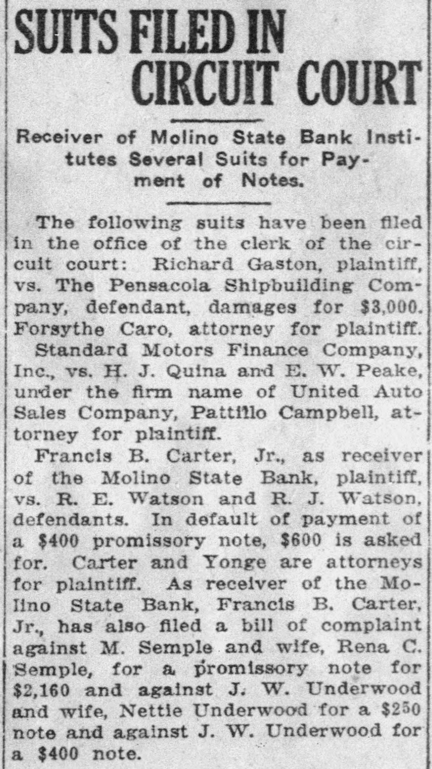 Francis B. Carter, Jr., as receiver of the Molino State Bank, plaintiff, vs. R. E. Watson and R. J. Watson, defendants. In default of payment of a $400 promissory note, $600 is asked for. Carter and Yonge are attorneys for plaintiff. As receiver of the Molino State Bank, Francis B. Carter, Jr., has also filed a bill of complaint against M. Semple and wife, Rena C. Semple, for a promissory note for $2,160 and against J. W. Underwood and wife, Nettie Underwood for a $250 note and against J. W. Underwood for a $400 note.