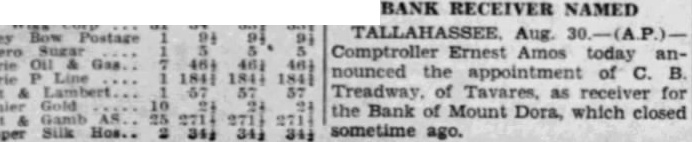 NAMES TREADWAY BANK RECEIVER Comptroller Amos has appointed C. B. Treadaway of Tavares, as receiver for the Bank of Mount Dora, which closed its Goors for business several weeks ago.