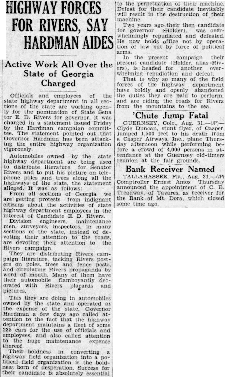 HIGHWAY FORCES FOR RIVERS, SAY HARDMAN AIDES Active Work All Over the State of Georgia Charged Officials and employees of the state highway department in all sections of the state are working openly for the nomination of State Sena tor E. Rivers for governor, was charged in issued Friday by the Hardman campaign committee. The statement pointed out that Governor Hardman has been attacking the entire highway organization vigorously Automobiles owned by the state highway department are being usea to distribute literature for Senator Rivers and to put his picture on telephone poles and trees along all the highways of the state, the alleged. It was as From all sections of Georgia we are getting protests from indignant citizens about the activities of state highway department employees in the interest of Candidate E. D. Rivers. Division engineers, men. in many sections of the state, instead of devoting their attention to the roads, are devoting their attention to the Rivers campaign They distributing Rivers campaign literature. tacking Rivers posters on poles. and fence posts, Rivers by word of mouth. Many of them have their automobile decorated with Rivers placards and pictures. This they are doing in automobiles owned by the state and operated at the expense of the state. Governor Hardman a few days ago called attention to the fact that the highway department fleet of some 235 cars for the use of officials and employees. and also called attention to the huge maintenance expense thereof Their boldness in converting highway field organization into political field organization the boldness born of desperation. Success for their candidate is absolutely essential to the perpetuation of their machine. Defeat for their candidate inevitably will result in the destruction of their Two years ago their then candidate for governor (Holder was overwhelmingly repudiated and defeated. He now holds office not by operation of law but by force of political arms. In the present campaign their present candidate (Holder, alias Rivers), is headed for another overrepudiation and That is why so many of the field forces of the highway department have boldly and openly abandoned the duties they are paid to perform, and are riding roads for Rivers from the mountains to the sea. 'Chute Jump Fatal GUERNSEY Colo., Aug. Clyde Duncan, stunt flyer, of Casper jumped 1,500 feet to his death from a Casper Airways, Inc., plane Thursday afternoon while performing before crowd of 4,000 persons in tendance at the Guernsey old-timers reunion at the fair grounds. Bank Receiver Named TALLAHASSEE Aug. 31.-(P) Comptroller Ernest Amos Thursday announced the appointment of C. B. Treadway, of Tavares. as receiver for the Bank of Mt. Dora, which closed some time ago.