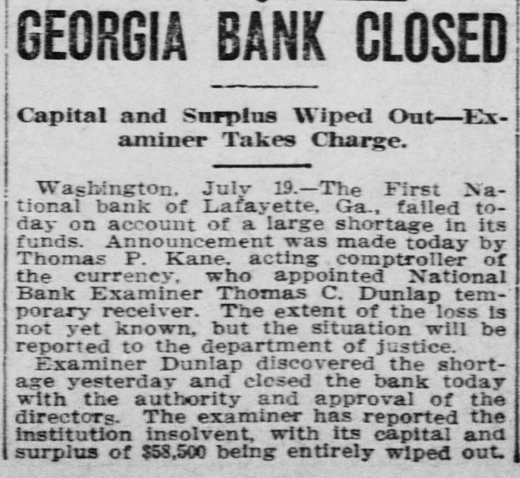 GEORGIA BANK CLOSED Capital and Surplus Wiped Out-Examiner Takes Charge. Washington. July 19.-The First National bank of Lafayette, Ga., failed today on account of a large shortage in its funds. Announcement was made today by Thomas P. Kane. acting comptroller of the currency, who appointed National Bank Examiner Thomas C. Dunlap temporary receiver. The extent of the loss is not yet known, but the situation will be reported to the department of justice. Examiner Dunlap discovered the shortage yesterday and closed the bank today with the authority and approval of the directors. The examiner has reported the institution insolvent, with its capital and surplus of $58,500 being entirely wiped out.