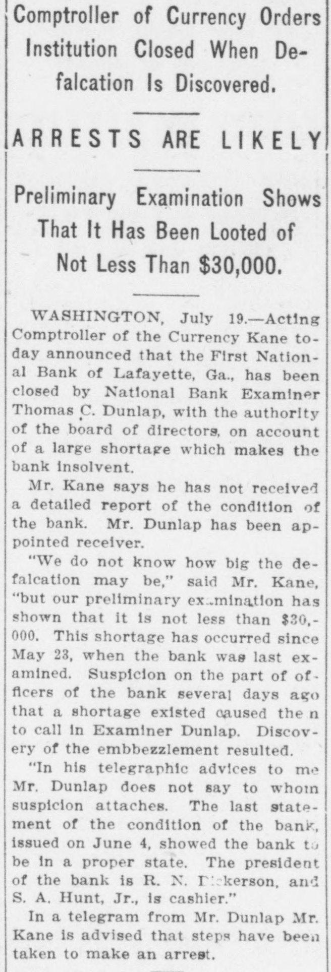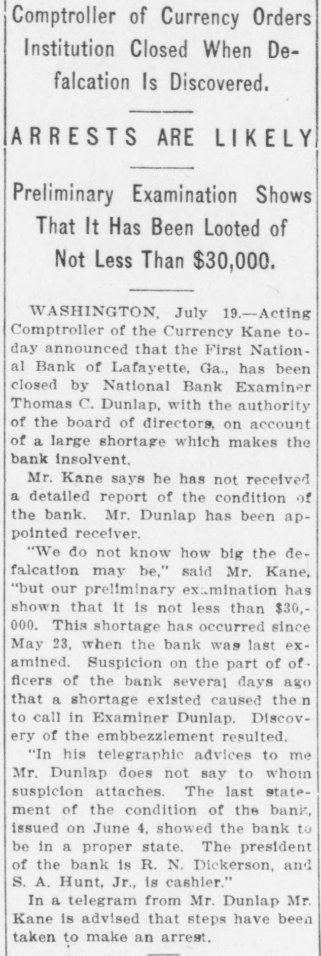 Comptroller of Currency Orders Institution Closed When Defalcation Is Discovered. ARRESTS ARE LIKELY Preliminary Examination Shows That It Has Been Looted of Not Less Than $30,000. WASHINGTON, July 19.-Acting Comptroller of the Currency Kane today announced that the First National Bank of Lafayette, Ga., has been closed by National Bank Examiner Thomas C. Dunlap, with the authority of the board of directors, on account of a large shortage which makes the bank insolvent. Mr. Kane says he has not received a detailed report of the condition of the bank. Mr. Dunlap has been appointed receiver. "We do not know how big the defalcation may be," said Mr. Kane, "but our preliminary examination has shown that it is not less than $30,000., This shortage has occurred since May 23, when the bank was last examined. Suspicion on the part of officers of the bank several days ago that a shortage existed caused the n to call in Examiner Dunlap. Discovery of the embbezzlement resulted. "In his telegraphic advices to me Mr. Dunlap does not say to whom suspicion attaches. The last statement of the condition of the bank, issued on June 4, showed the bank to be in a proper state. The president of the bank is R. N. Dickerson, and S. A. Hunt, Jr., is cashier." In a telegram from Mr. Dunlap Mr. Kane is advised that steps have been taken to make an arrest.