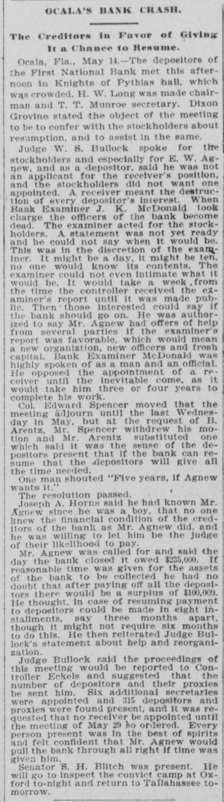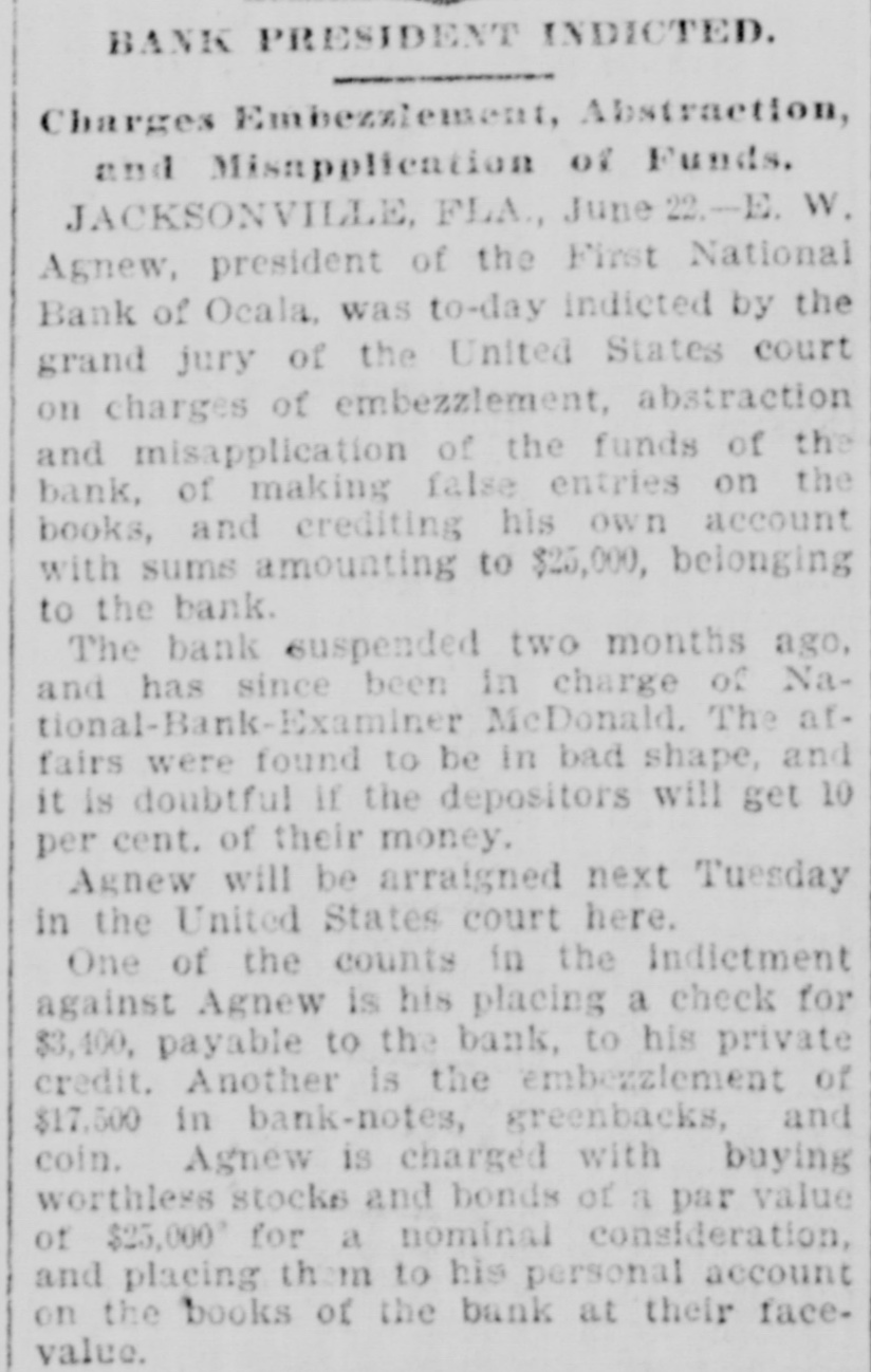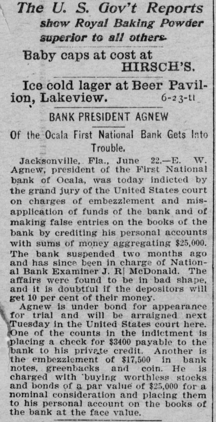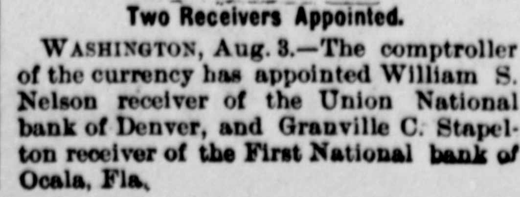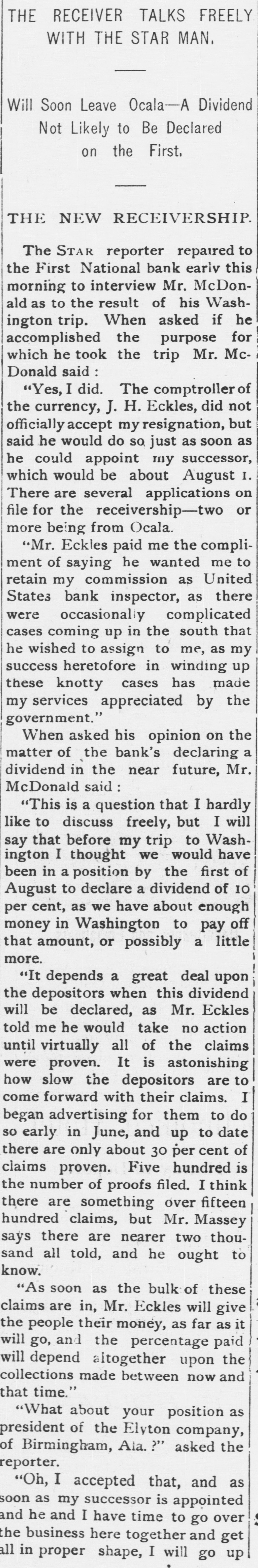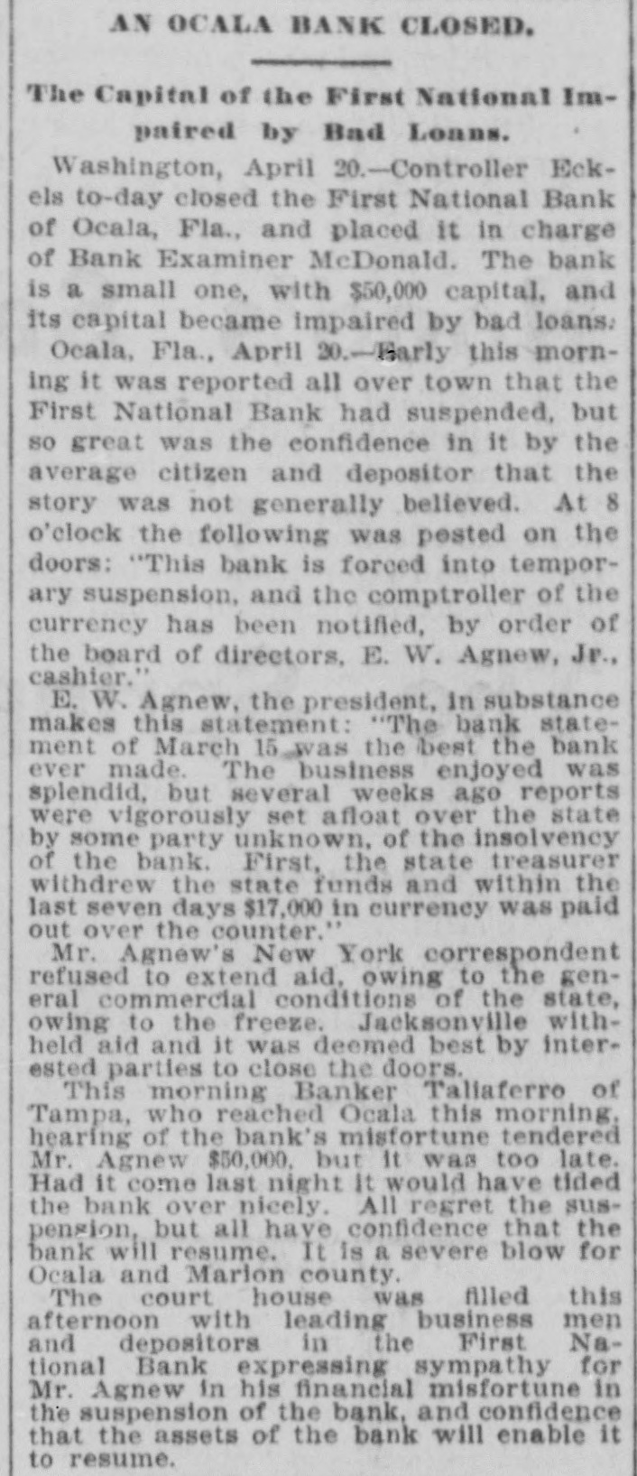 THE First national bank of Ocala, Fla., closed it doors.