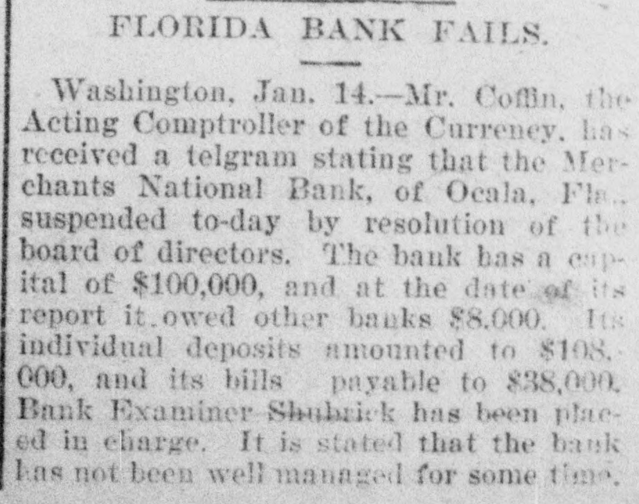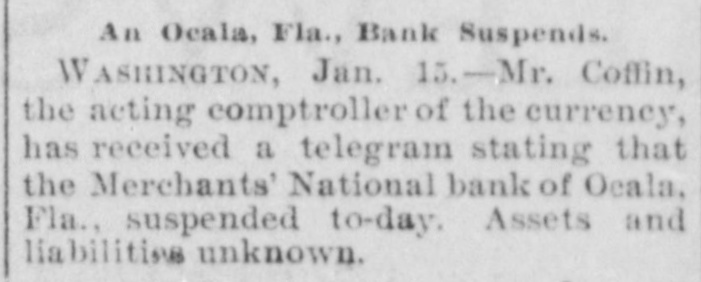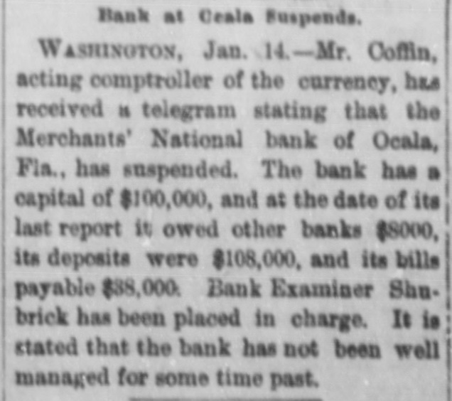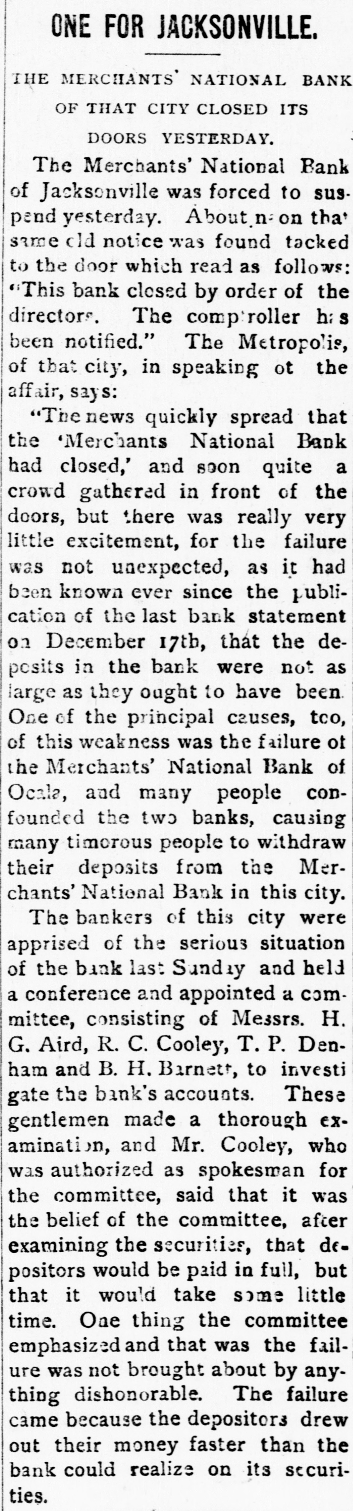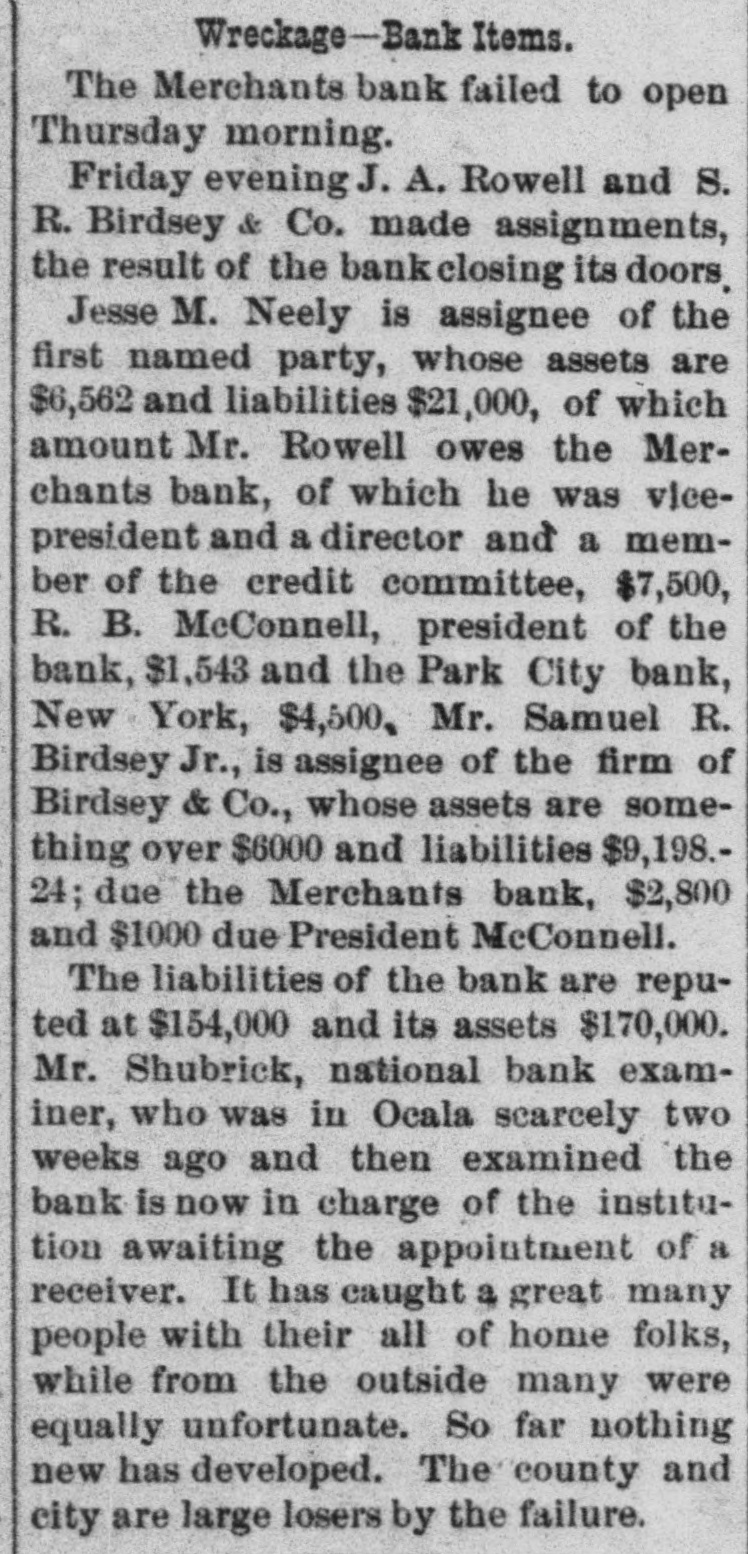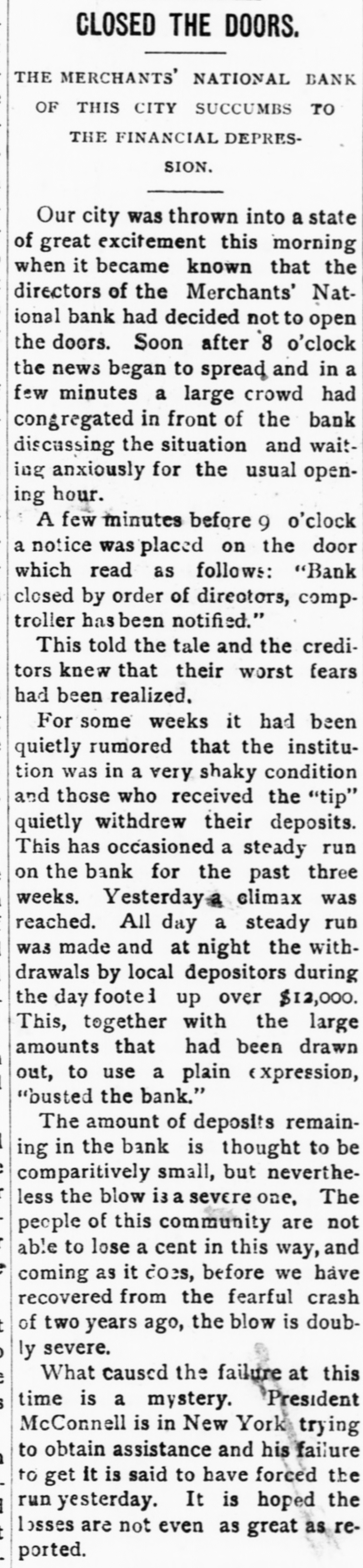 CLOSED THE DOORS. THE MERCHANTS' NATIONAL BANK OF THIS CITY SUCCUMBS TO THE FINANCIAL DEPRESSION. Our city was thrown into a state of great excitement this morning when it became known that the directors of the Merchants' National bank had decided not to open the doors. Soon after 8 o'clock the news began to spread and in a few minutes a large crowd had congregated in front of the bank discussing the situation and waiting anxiously for the usual opening hour. A few minutes before 9 o'clock a notice was placed on the door which read as follows: "Bank closed by order of directors, comptroller has been notified." This told the tale and the creditors knew that their worst fears had been realized. For some weeks it had been quietly rumored that the institution was in a very shaky condition and those who received the "tip" quietly withdrew their deposits. This has occasioned a steady run on the bank for the past three weeks. Yesterday a climax was reached. All day a steady rub was made and at night the withdrawals by local depositors during the day footel up over $12,000. This, together with the large amounts that had been drawn out, to use a plain expression, "busted the bank." The amount of deposits remaining in the bank is thought to be comparitively small, but nevertheless the blow i3 a severe one, The people of this community are not able to lose a cent in this way, and coming as it does, before we have recovered from the fearful crash of two years ago, the blow is doubly severe. What caused the failure at this time is a mystery. President McConnell is in New York trying to obtain assistance and his failure to get it is said to have forced the run yesterday. It is hoped the losses are not even as great as reported.