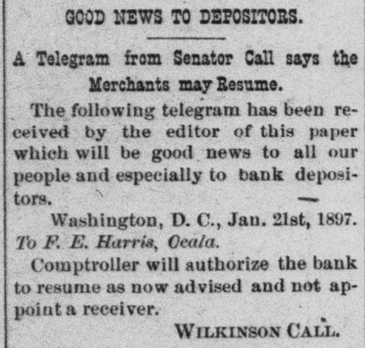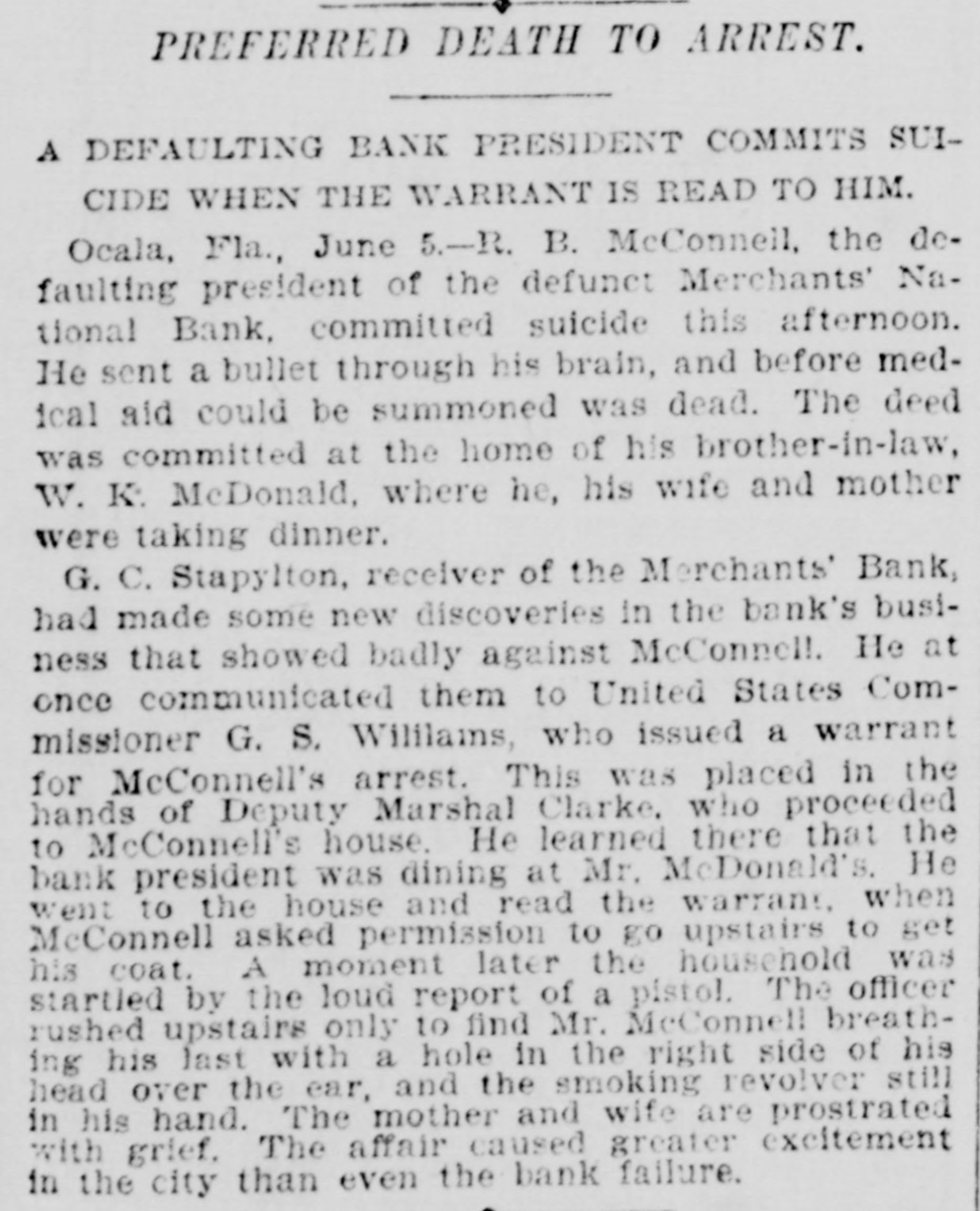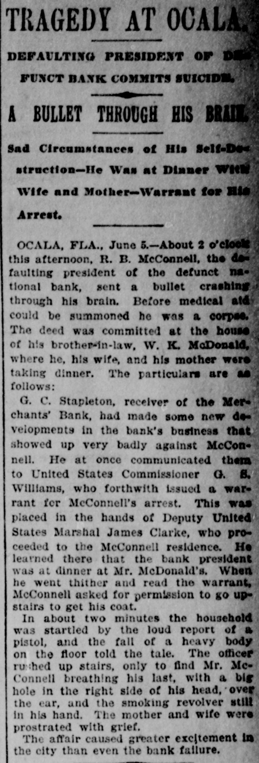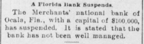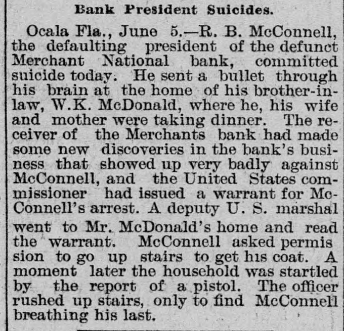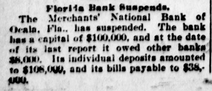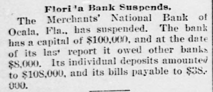 CLOSED THE DOORS. THE MERCHANTS' NATIONAL BANK OF THIS CITY SUCCUMBS TO THE FINANCIAL DEPRESSION. Our city was thrown into a state of great excitement this morning when it became known that the directors of the Merchants' National bank had decided not to open the doors. Soon after 8 o'clock the news began to spread and in a few minutes a large crowd had congregated in front of the bank discussing the situation and waiting anxiously for the usual opening hour. A few minutes before 9 o'clock a notice was placed on the door which read as follows: "Bank closed by order of directors, comptroller has been notified." This told the tale and the creditors knew that their worst fears had been realized. For some weeks it had been quietly rumored that the institution was in a very shaky condition and those who received the "tip" quietly withdrew their deposits. This has occasioned a steady run on the bank for the past three weeks. Yesterday a climax was reached. All day a steady rub was made and at night the withdrawals by local depositors during the day footel up over $12,000. This, together with the large amounts that had been drawn out, to use a plain expression, "busted the bank." The amount of deposits remaining in the bank is thought to be comparitively small, but nevertheless the blow i3 a severe one, The people of this community are not able to lose a cent in this way, and coming as it does, before we have recovered from the fearful crash of two years ago, the blow is doubly severe. What caused the failure at this time is a mystery. President McConnell is in New York trying to obtain assistance and his failure to get it is said to have forced the run yesterday. It is hoped the losses are not even as great as reported.