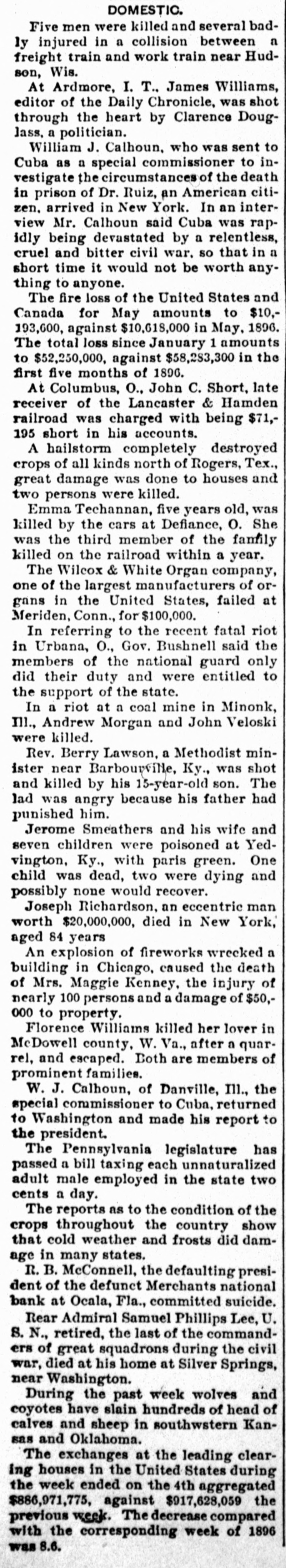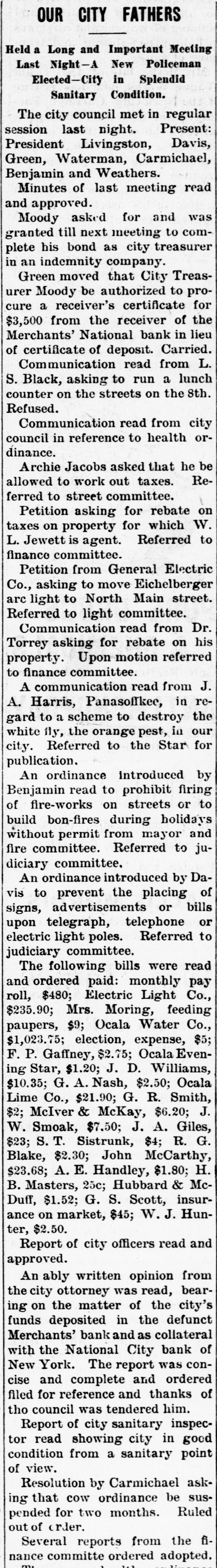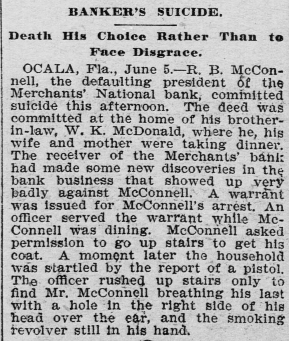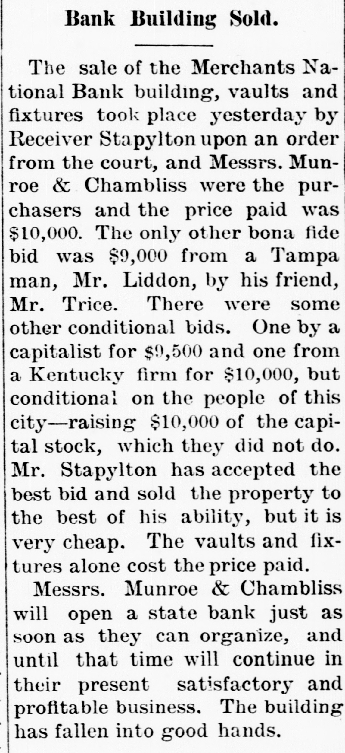 CLOSED THE DOORS. THE MERCHANTS' NATIONAL BANK OF THIS CITY SUCCUMBS TO THE FINANCIAL DEPRESSION. Our city was thrown into a state of great excitement this morning when it became known that the directors of the Merchants' National bank had decided not to open the doors. Soon after 8 o'clock the news began to spread and in a few minutes a large crowd had congregated in front of the bank discussing the situation and waiting anxiously for the usual opening hour. A few minutes before 9 o'clock a notice was placed on the door which read as follows: "Bank closed by order of directors, comptroller has been notified." This told the tale and the creditors knew that their worst fears had been realized. For some weeks it had been quietly rumored that the institution was in a very shaky condition and those who received the "tip" quietly withdrew their deposits. This has occasioned a steady run on the bank for the past three weeks. Yesterday a climax was reached. All day a steady rub was made and at night the withdrawals by local depositors during the day footel up over $12,000. This, together with the large amounts that had been drawn out, to use a plain expression, "busted the bank." The amount of deposits remaining in the bank is thought to be comparitively small, but nevertheless the blow i3 a severe one, The people of this community are not able to lose a cent in this way, and coming as it does, before we have recovered from the fearful crash of two years ago, the blow is doubly severe. What caused the failure at this time is a mystery. President McConnell is in New York trying to obtain assistance and his failure to get it is said to have forced the run yesterday. It is hoped the losses are not even as great as reported.
