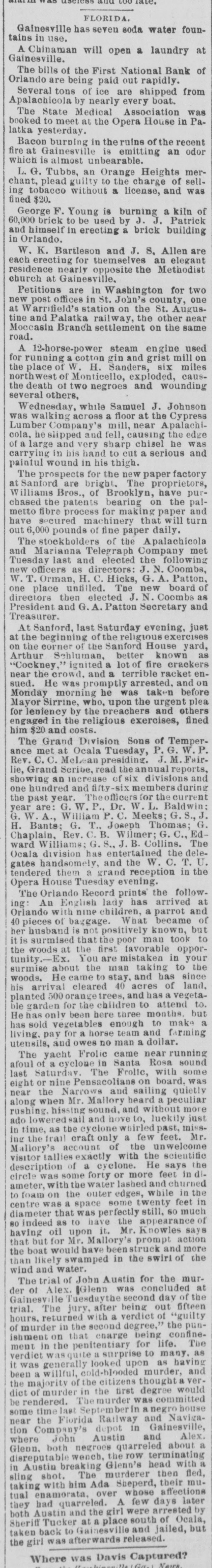 'AIRI 001 DUR SIRE AA FLORIDA. Gainesville has seven soda water tains in use. A Chinaman will open a laundry Gainesville. The bills of the First National Bank Orlando are being paid out rapidly. Several tons of ice are shipped Apalachicola by nearly every boat. The State Medical Association booked to meet at the Opera House in latka yesterday. Bacon burning in the ruins of the fire at Gainesville is emitting an which is almost unbearable. L. G. Tubbs, an Orange Heights chant, plead guilty to the charge of ing tobacco without a license, and $200 peug George F. Young is burning a kiln 60,000 brick to be used by J. J. Patric and himself in erecting a brick buildin in Orlando. W. K. Bartleson and J. S. Allen each erecting for themselves an elegan residence nearly opposite the Methodis church at Gainesville, Petitions are in Washington for new post offices in St. John's county, at Warrifield's station on the St. tine and Palatka railway, the other Moccasin Branch settlement on the road. A 12-horse-power steam engine for running a cotton gin and grist mill the place of W. H. Sanders, six northwest of Monticello, exploded, the death of two negroes and woundin several others, Wednesday, while Samuel J. Johnso was walking across a floor at the Cypres Lumber Company's mill, near Apalach cola, he slipped and fell, causing the of a large and very sharp chisel he carrying in his hand to cut a serious painful wound in his thigh. The prospects for the new paper factor at Sanford are bright. The proprietor illiams Bros., of Brooklyn, have chased the patents bearing on the metto fibre process for making paper have secured machinery that will out 6,000 pounds of fine paper daily. The stockholders of the Apalachicol and Marianna Telegraph Company Tuesday last and elected the followin new officers as directors: J. N. Coomb W.T. Orman, H. C. Hicks, G. A. Patto one place unfilled. The new board directors then elected J. N. Coombs President and G.A. Patton Secretary Treasurer. At Sanford, last Saturday evening, at the beginning of the religious exercise on the corner of the Sanford House Arthur Schluman, better known "Cockney," ignited a lot of fire cracke near the crowd, and a terrible racket sued. He was promptly arrested, and Monday morning he was taken Mayor Sirrine, who, upon the urgent for leniency by the preachers and engaged in the religious exercises, him $20 and costs. The Grand Division Sons of Tempe ance met at Ocala Tuesday, P. G. W. Rev. C.C. McLean presiding. J. M. lie, Grand Scribe, read the annual report showing an increase of six divisions one hundred and fifty-six members the past year. Theofficers for the year are: G. W. P., Dr. W. L. Baldwit G. W. A., William P. C. Meeks; G. S., H. Bants: G. T., Joseph Thomas; Chaplain, Rev. C.B. Wilmer; G. C., ward Williams: G.S., J. B. Collins. Ocala division has entertained the gates handsomely, and the W. C. T. tendered them a grand reception in Opera House Tuesday evening. The Orlando Record prints the ing: An English lady has arrived Orlando with nine children, a parrot 40 pieces of baggage. What became her husband is not positively known, it is surmised that the poor man took the woods at the first favorable tunity.-Ex. You are mistaken in surmise about the man taking to woods. He came to stay, and has his arrival cleared 40 acres of planted 500 orange trees, and has a ble garden for the children to attend He has only been here three months. has sold vegetables enough to make living. pay for a horse team and farmin utensils, and owes no man a dollar. The yacht Frolic came near runnin afoul of a cyclone in Santa Rosa