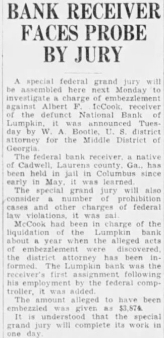 Indicted by a federal grand jury yesterday morning, Albert F. McCook, national bank receiver, appeared immediately before Federal Judge Bascom S. Deaver, admitted he had embezzled $3,811 from the National Bank of Lumpkin, and was sentenced to serve two years in the federal penitentiary Thus, his first assignment as national bank receiver ended. Mc. Cook, resident of Cadwell, in Laurens county, took charge of the defunct Lumpkin bank in December, 1929. Early in 1930, his embezzlements began, United States Attorney W. A. Bootle told the court yesterday.