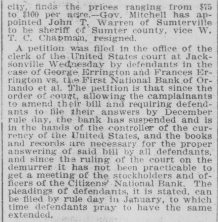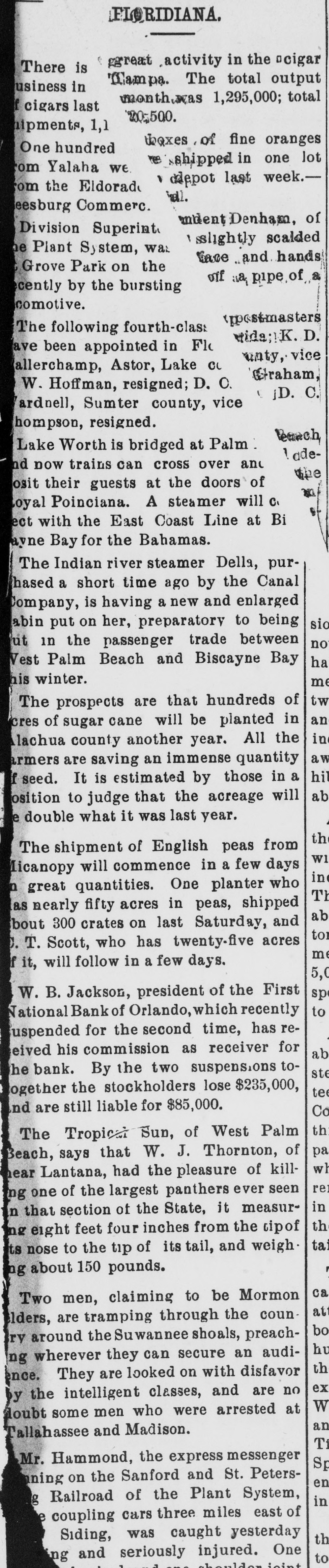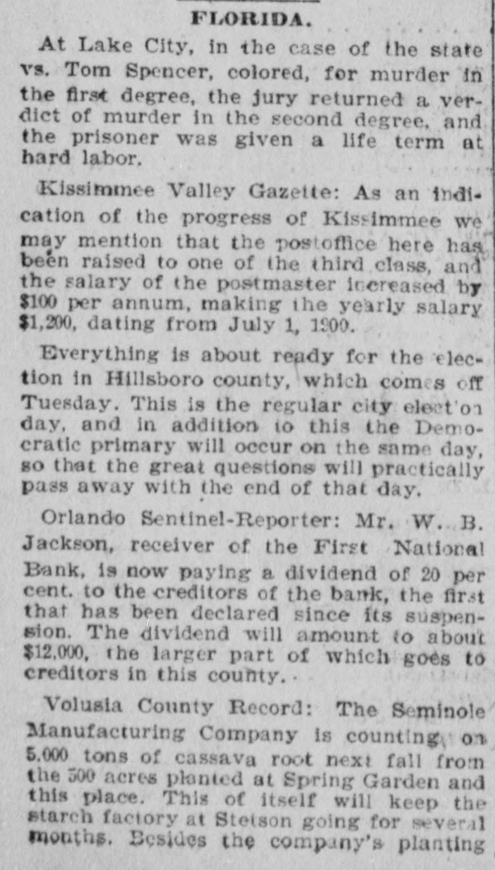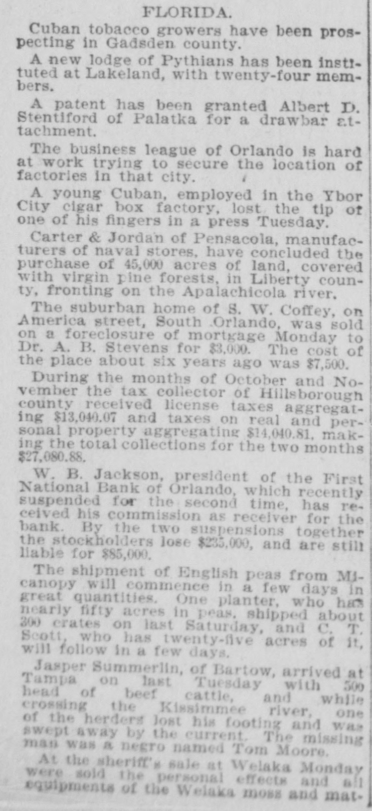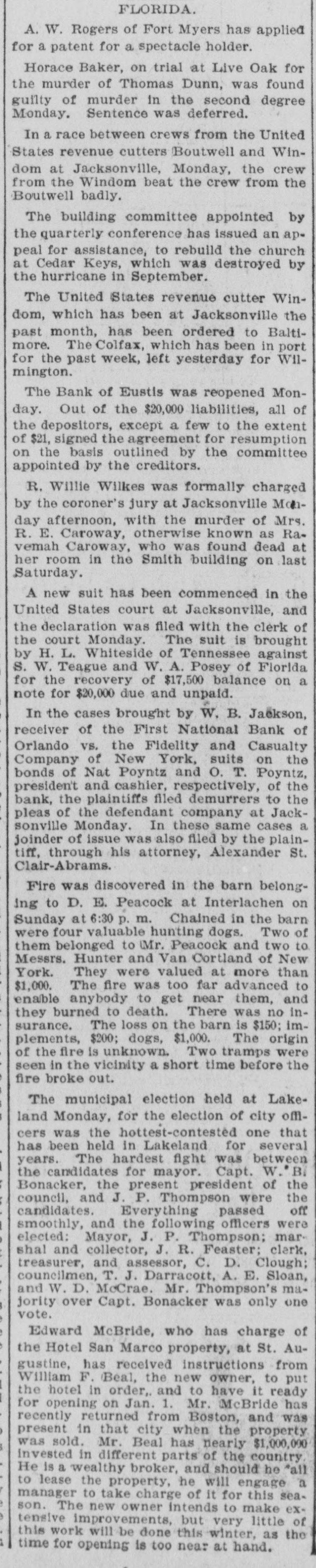 A. W. Rogers of Fort Myers has applied for a patent for a spectacle holder. Horace Baker, on trial at Live Oak for the murder of Thomas Dunn, was found guilty of murder in the second degree Monday. Sentence was deferred. In a race between crews from the United States revenue cutters Boutwell and Windom at Jacksonville, Monday, the crew from the Windom beat the crew from the Boutwell badly. The building committee appointed by the quarterly conference has issued an appeal for assistance, to rebuild the church at Cedar Keys, which was destroyed by the hurricane in September. The United States revenue cutter Windom, which has been at Jacksonville the past month, has been ordered to Baltimore. The Colfax, which has been in port for the past week, left yesterday for Wilmington. The Bank of Eustis was reopened Monday. Out of the $20,000 liabilities, all of the depositors, except a few to the extent of $21, signed the agreement for resumption on the basis outlined by the committee appointed by the creditors. R. Willie Wilkes was formally charged by the coroner's jury at Jacksonville Mchday afternoon, with the murder of Mrs. R. E. Caroway, otherwise known as Ravemah Caroway, who was found dead at her room in the Smith building on last Saturday. A new suit has been commenced in the United States court at Jacksonville, and the declaration was filed with the clerk of the court Monday. The suit is brought by H. L. Whiteside of Tennessee against S. W. Teague and W. A. Posey of Florida for the recovery of $17,500 balance on a note for $20,000 due and unpaid. In the cases brought by W. B. Jackson, receiver of the First National Bank of Orlando vs. the Fidelity and Casualty Company of New York, suits on the bonds of Nat Poyntz and O. T. Poyntz, presiden't and cashier, respectively, of the bank, the plaintiffs filed demurrers to the pleas of the defendant company at Jacksonville Monday. In these same cases a joinder of issue was also filed by the plaintiff, through his attorney, Alexander St. Clair-Abrams. Fire was discovered in the barn belonging to D. E. Peacock at Interlachen on Sunday at 6:30 p. m. Chained in the barn were four valuable hunting dogs. Two of them belonged to Mr. Peacock and two to Messrs. Hunter and Van Cortland of New York. They were valued at more than $1,000. The fire was too far advanced to enable anybody to get near them, and they burned to death. There was no insurance. The loss on the barn is $150; implements, $200; dogs, $1,000. The origin of the fire is unknown. Two tramps were seen in the vicinity a short time before the fire broke out. The municipal election held at Lakeland Monday, for the election of city officers was the hottest-contested one that has been held in Lakeland for several years. The hardest fight was between the candidates for mayor. Capt. W." B. Bonacker, the present president of the council, and J. P. Thompson were the candidates. Everything passed off smoothly, and the following officers were elected: Mayor, J. P. Thompson; marshal and collector, J. R. Feaster; clerk, treasurer, and assessor, C. D. Clough; councilmen, T. J. Darracott, A. E. Sloan, and W. D. McCrae. Mr. Thompson's majority over Capt. Bonacker was only one vote. Edward McBride, who has charge of the Hotel San Marco property, at St. Augustine, has received instructions from William F. Beal, the new owner, to put the hotel in order, and to have it ready for opening on Jan. 1. Mr. McBride has recently returned from Boston, and was present in that city when the property was sold. Mr. Beal has nearly $1,000,000 invested in different parts of the country. He is a wealthy broker, and should he "all to lease the property, he will engage a manager to take charge of it for this season. The new owner intends to make extensive improvements, but very little of this work will be done this winter as the