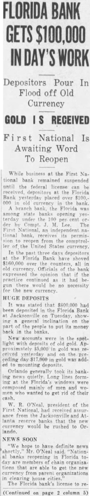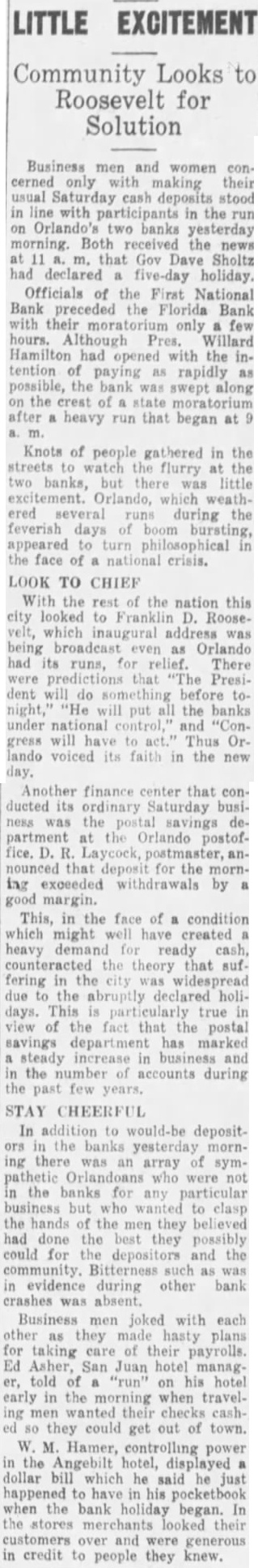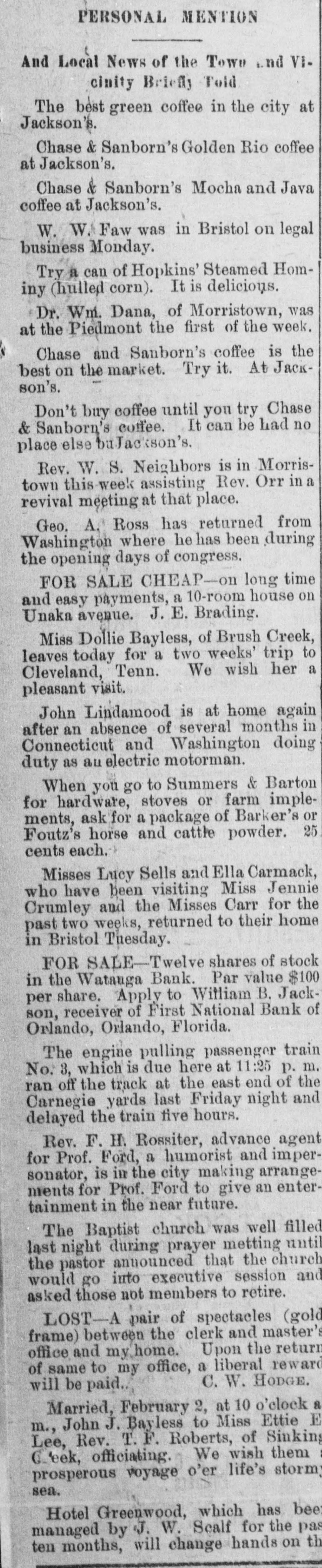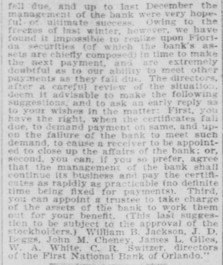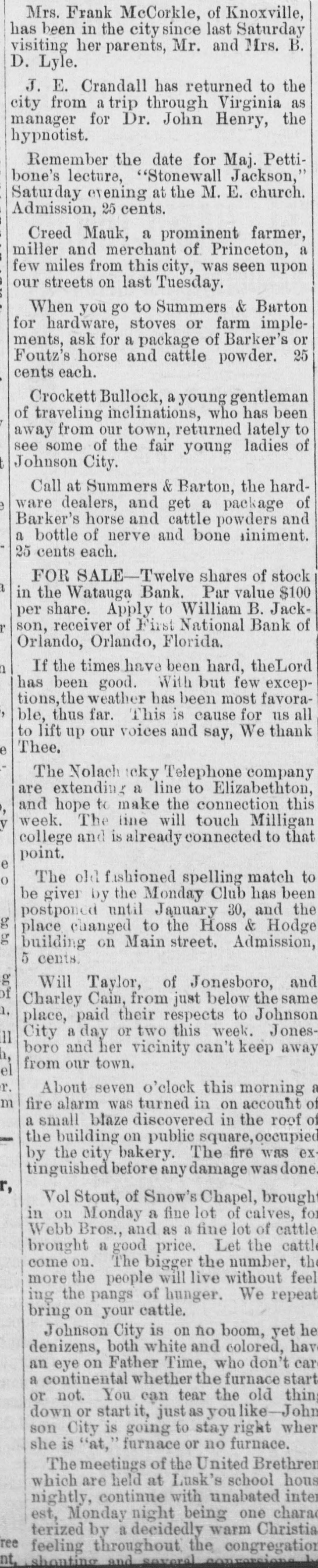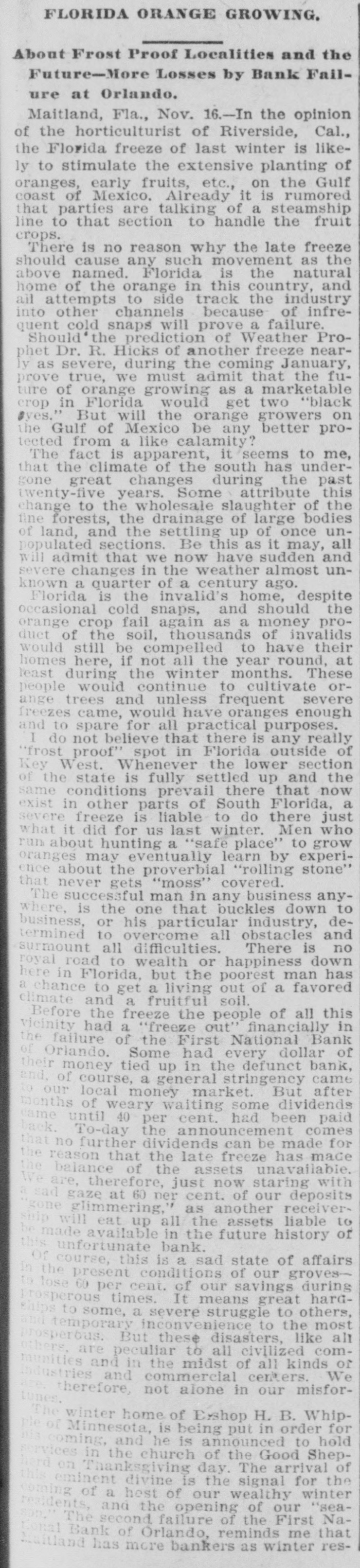 A. W. Rogers of Fort Myers has applied for a patent for a spectacle holder. Horace Baker, on trial at Live Oak for the murder of Thomas Dunn, was found guilty of murder in the second degree Monday. Sentence was deferred. In a race between crews from the United States revenue cutters Boutwell and Windom at Jacksonville, Monday, the crew from the Windom beat the crew from the Boutwell badly. The building committee appointed by the quarterly conference has issued an appeal for assistance, to rebuild the church at Cedar Keys, which was destroyed by the hurricane in September. The United States revenue cutter Windom, which has been at Jacksonville the past month, has been ordered to Baltimore. The Colfax, which has been in port for the past week, left yesterday for Wilmington. The Bank of Eustis was reopened Monday. Out of the $20,000 liabilities, all of the depositors, except a few to the extent of $21, signed the agreement for resumption on the basis outlined by the committee appointed by the creditors. R. Willie Wilkes was formally charged by the coroner's jury at Jacksonville Mchday afternoon, with the murder of Mrs. R. E. Caroway, otherwise known as Ravemah Caroway, who was found dead at her room in the Smith building on last Saturday. A new suit has been commenced in the United States court at Jacksonville, and the declaration was filed with the clerk of the court Monday. The suit is brought by H. L. Whiteside of Tennessee against S. W. Teague and W. A. Posey of Florida for the recovery of $17,500 balance on a note for $20,000 due and unpaid. In the cases brought by W. B. Jackson, receiver of the First National Bank of Orlando vs. the Fidelity and Casualty Company of New York, suits on the bonds of Nat Poyntz and O. T. Poyntz, presiden't and cashier, respectively, of the bank, the plaintiffs filed demurrers to the pleas of the defendant company at Jacksonville Monday. In these same cases a joinder of issue was also filed by the plaintiff, through his attorney, Alexander St. Clair-Abrams. Fire was discovered in the barn belonging to D. E. Peacock at Interlachen on Sunday at 6:30 p. m. Chained in the barn were four valuable hunting dogs. Two of them belonged to Mr. Peacock and two to Messrs. Hunter and Van Cortland of New York. They were valued at more than $1,000. The fire was too far advanced to enable anybody to get near them, and they burned to death. There was no insurance. The loss on the barn is $150; implements, $200; dogs, $1,000. The origin of the fire is unknown. Two tramps were seen in the vicinity a short time before the fire broke out. The municipal election held at Lakeland Monday, for the election of city officers was the hottest-contested one that has been held in Lakeland for several years. The hardest fight was between the candidates for mayor. Capt. W." B. Bonacker, the present president of the council, and J. P. Thompson were the candidates. Everything passed off smoothly, and the following officers were elected: Mayor, J. P. Thompson; marshal and collector, J. R. Feaster; clerk, treasurer, and assessor, C. D. Clough; councilmen, T. J. Darracott, A. E. Sloan, and W. D. McCrae. Mr. Thompson's majority over Capt. Bonacker was only one vote. Edward McBride, who has charge of the Hotel San Marco property, at St. Augustine, has received instructions from William F. Beal, the new owner, to put the hotel in order, and to have it ready for opening on Jan. 1. Mr. McBride has recently returned from Boston, and was present in that city when the property was sold. Mr. Beal has nearly $1,000,000 invested in different parts of the country. He is a wealthy broker, and should he "all to lease the property, he will engage a manager to take charge of it for this season. The new owner intends to make extensive improvements, but very little of this work will be done this winter as the