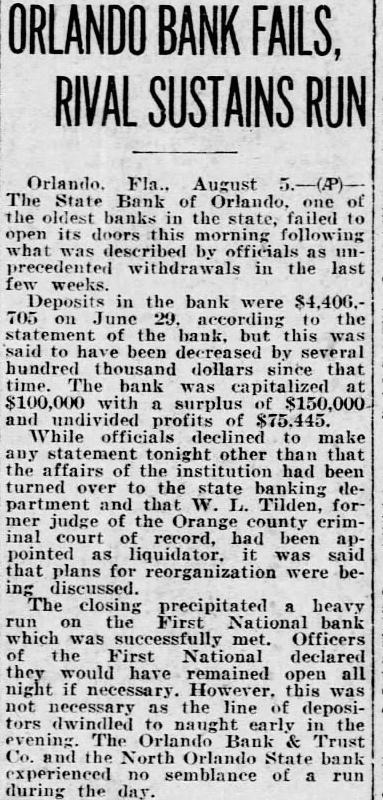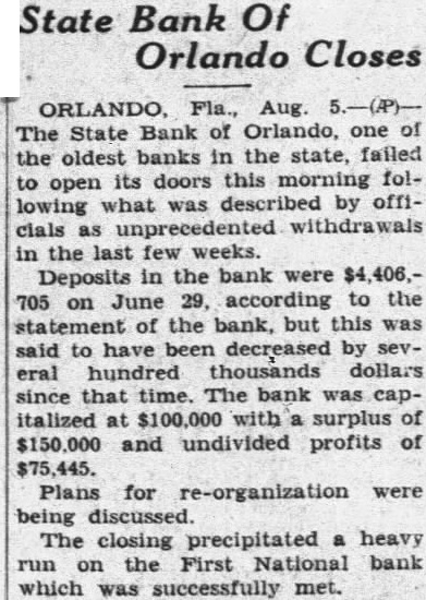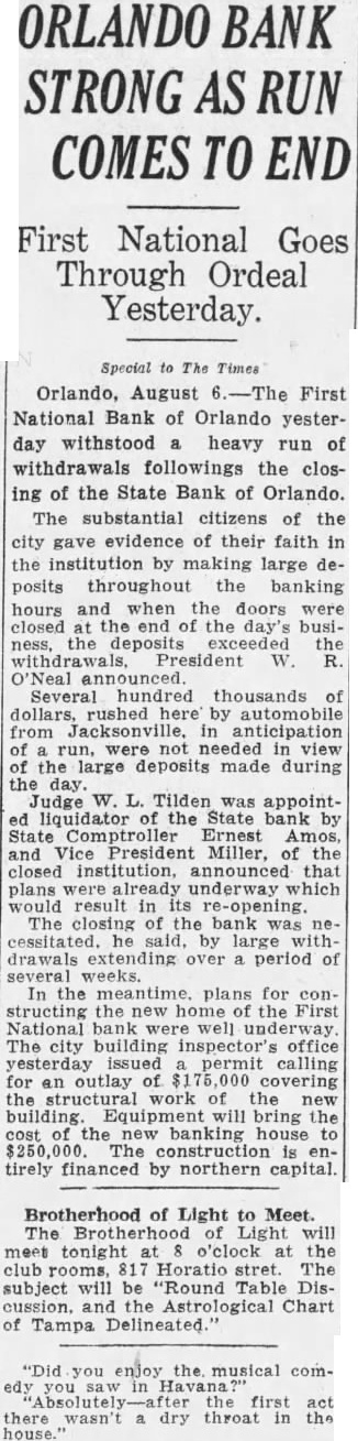 The thing had building had received the bonds which bank shape that taxes up figured the value figure bank should be sold today those dollar. be willing to the notes made the $70,000 Building $160,000 bonds the Finance company. The State Building company the building. shouldn't they building on their there bank building State Florida that built in any other way building The not do not have assets liabilities Banking came down weeks audit books. depositors and collect all and the debts. White he had found would irregularity, he found nothing the least that have any those board direcreport from the bank examiner good. understood that all right, some hard luck about that man know deposited $100,other day could interest note. Some understand the difference between the examiner's statement showing my statement Naturally, when bank closes many checks stopped and approximately checks turned back shortly after the bank closed. also owed the First National Bank some money Atlantic National Bank money, and the difference these the amount checks which payment stopped Talton, cashier, State Bank Apopka since of the State Bank the State Bank Orlando July, 1929, account closed July 18, 1929. money taken Apopka and kept in the vault took me from July vault Apopka, after brought Orlando, where the Bank again. deposit money, put safety deposit instead. The the bank, Dr. with me the deposit brought the money to Orlando protection. drew $90,000 July 18. given three by the and sent them to credit, they recognized and were back Then brought them back Orlando exchange indebtedness gave balance exchanged bond trustees for government bonds which also converted cash and the vaults. From July 18 to July kept Apopka kept policemen guarding the bank night. the decided advisable keep under conditions brought back Orlando protect depositors. and decided was safe to leave where then money the State Orlando officers and did not have the right the The money taken out