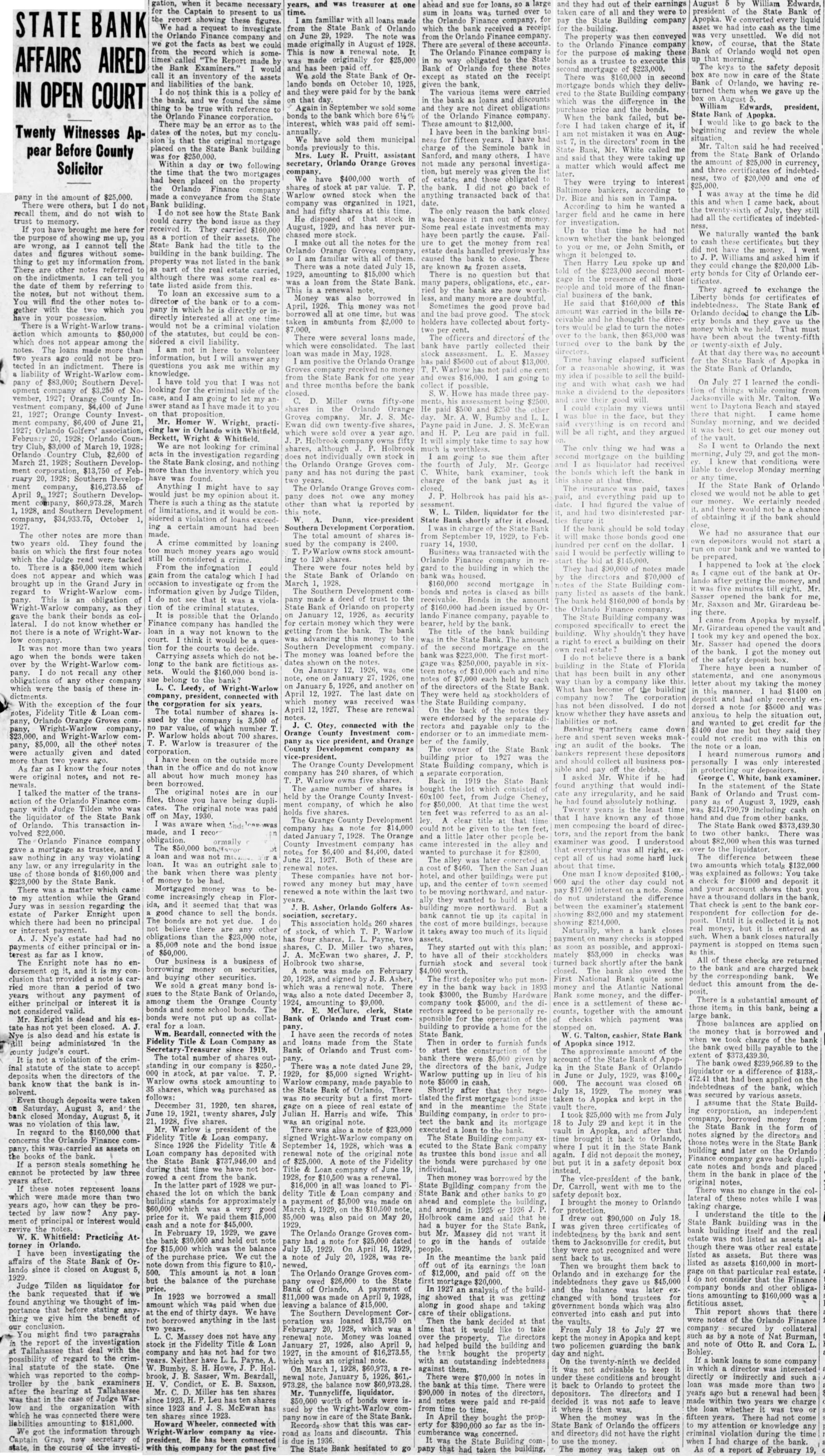 Twenty Witnesses Before pear Solicitor pany in the amount of $25,000. There were others, but do not recall them, not wish trust memory. If have brought me here for you the purpose of showing wrong, cannot tell dates figures without something get my information from. There are other notes referred indictments. tell you date of them by referring notes, but not without them. You will find the other notes gether with the two which you your There transaction which amounts $50,000 which appear among the notes. loans made more than ago could not There liability pany Southern Development $3,250 of vember, 1927; Orange County Investment company, Orange County InvestJune 1927: Orlando Golfers' association, February 1928; Orlando CounClub, March 1928; Orlando Country Club, $2,600 March 21. 1928; Southern Development ruary 20, 1928; ment $16,273.55 April 1927; Southern DevelopMarch 1928, company, $34,933.75, October The other notes are more than years They found the basis the first four which the read tacked $50,000 item which does and which brought the Grand Jury regard pany. This obligation as they gave the bank bonds not note of company. than two years ago the taken by the company. recall other obligations company which were the basis of these With of the four notes, Fidelity Title Loan company, Orlando Orange Groves comcompany, and company, the other notes actually given dated than years ago. As far notes original notes, and not newals. talked the matter of the transaction Orlando Finance Judge Tilden the liquidator State Bank Orlando. This transaction volved $22,000. Finance company trustee, and nothing violating any irregularity those bonds by the State Bank. There matter which came my attention while Grand Jury session regarding the was estate Parker Enright which there had no principal payment. estate had had payments either principal terest know. The Enright no dorsement it my clusion that note ried more period years without payment of either principal interest Mr. Enright dead and his has been closed. also dead and his estate being administered in the county judge's court. of the criminal statute of the state accept when the directors of the bank know that the bank solvent. Even though deposits were taken August and closed Monday, August this In regard the that the Orlando Finance pany, this as assets on of the bank. he cannot protected by law three years these notes represent loans which were made more than two years how can they be tected ment or interest would revive Whitfield: Practicing Attorney in Orlando. investigating the affairs State Bank lando since closed on August Judge Tilden as liquidator for bank requested that found anything thought importance that stating give him the benefit might find two paragrahs the report investigation Tallahassee that deal with regard to statute state. One which comptroller the bank examiners after the hearing Tallahassee that Judge and organization with liabilities the through Captain Gray, course the investi- gation, when became necessary the Captain present to report showing these figures. had request investigate Orlando Finance company got the facts we could from the record which someReport made Bank Examiners.' would the assets of the bank. think this policy the bank, and found the to with reference Orlando corporation. There an error to the dates of notes, but my concluthat original Bank building Within day two following time that the two mortgages had been placed the property the Orlando company made conveyance from the State building. not how the State Bank could carry the bond issue they received They carried portion their assets. The State Bank the title the building in the bank building. The property listed in the bank bart the real estate carried, although there some real tate listed aside from this. loan excessive director the bank pany which he directly directly interested all at one time would violation the statutes, but could be sidered civil liability. not here volunteer information, but will answer any questions you ask me within my have told that you was looking the side the case, am going my stand made to that Homer practilaw in with Beckett, We looking for criminal the investigation State closing, and nothing more than the which you might have would just my There thing the statute would be sidered loans certain amount had been crime committed by loaning much money ago would still the could gain from the catalog from the given Judge Tilden, do see that violation the possible that the Orlando company has the in not the think question for the courts decide. assets not the bank are the bond sue the Leedy, of the for six years. The total number sued by the 3,500 company which number holds about shares. treasurer the have the outside more than the know all about much has money original notes are in our files, being duplinote was paid May, when made, ormally loan outright the bank when there was plenty money Mortgaged was to come increasingly cheap Florseemed that that good chance to sell the bonds. bonds not yet due. believe there other obligations than $23,000 $5,000 the bond issue $50,000. Our business business of money securities, buying other securities. great many bond sues to the State Bank Orlando, among them the Orange County bonds some school bonds. The bonds were not put as collatBeardall, connected with the Fidelity Title Loan Secretary since The total shares standing our company 000 stock, owns stock amounting shares, which was purchased follows: December 31, shares, June twenty shares, July 1928, five shares. Mr. Warlow of the Fidelity Title Since 1926 the Fidelity Loan has the State during that time have not cent from the bank. chased the lot which building stands for approximately $60,000 price for them and note 19, 1929, gave the bank held which was balance the purchase price. cut the down from this figure to amount but the balance purchase price. 1923 borrowed small paid thirty borrowed anything in the last years. Ma