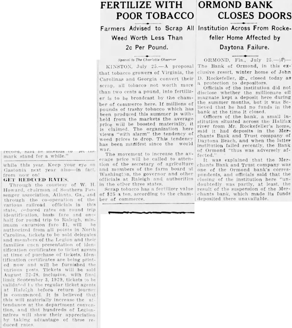 FERTILIZE WITH POOR TOBACCO ORMOND BANK CLOSES DOORS Farmers Advised to Scrap All Institution Across From RockeWeed Worth Less Than feller Home Affected by 2c Per Pound. Daytona Failure. that tobacco growers of Virginia, the Carolinas and Georgia convert their scrap, all tobacco not worth more than two pound, into fertilizer is to be broadcast by the chamber of commerce here. If millions of trashy tobacco which has been produced this summer is withheld from the markets the average price will boosted materially. claimed. The organization here views "with alarm" the tendency of weed prices drop. This tendency has been manifest since the world war The movement to increase the average price be called to attenwhile this year Keep your eye tion of the of year also-in and members of the farm board Gastonia next Washingt the governor and GET REDUCED RATES officials at Raleigh and authorities of W. H in the other Scrap tobacco has fertilizer value and of $25 ton. according to the chamsenger of the ber of commerce. through various railroad officials in this rates on round trip ORMOND, Fla., July The Bank of Ormond, in this exclusive resort. winter home of John D. Rockefeller, Sr., closed today as protection depositors. Officials of the institution did not disclose the here during the months, but it was Believed that he had no funds in the bank at the time closed Officers of the bank, small institution across the Halifax river from Mr. Rockefeller's home, said had in the Merchants Bank and Trust of Daytona and when the latter institution failed the Bank of Ormond "thus was adversely affected. It was explained that the Merchants Bank and Trust company was of the Ormond pondents, and officials said that the closing the institution here "undoubtedly partly, at least, the result the suspension of the Merchants bank. which made its funds deposited there unavailable. basis and onehalf for round trip to Raleigh, minimum $1, will be from all points North to be sold delegates and the Legion and their families presentation of Idencertificates to ticket agents at time of purchase of certificates are being print ed now and will be furnished the various Tickets be sold August inclusive, with final tickets the regular ticket agents at Raleigh before journey is commenced is believed that this will materially increase the tendance at the department convention. and that hundreds of Legion naires will show their appreciation by taking advantage of these duced rates