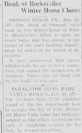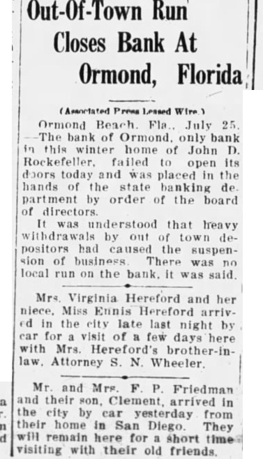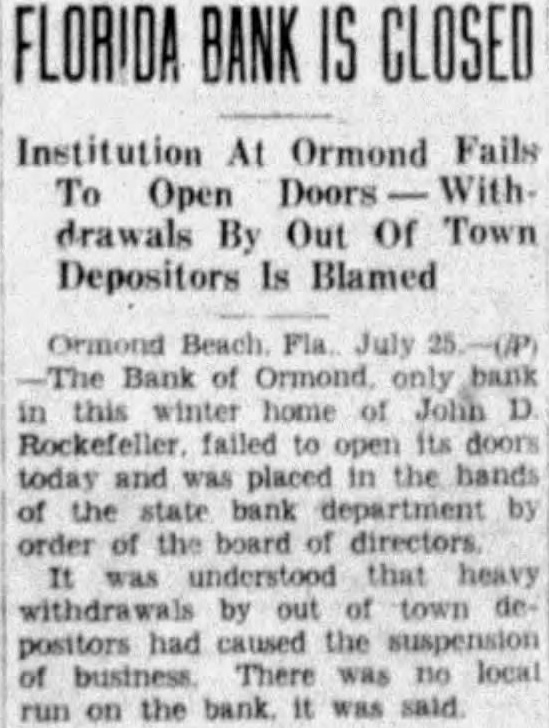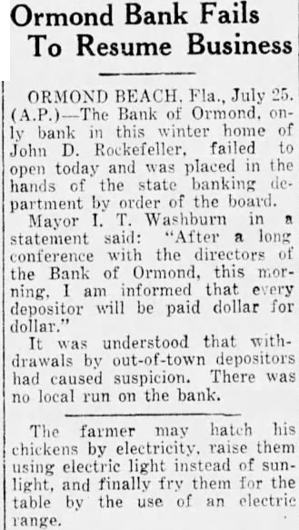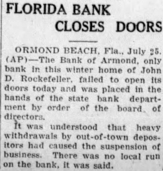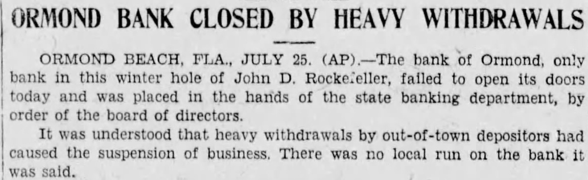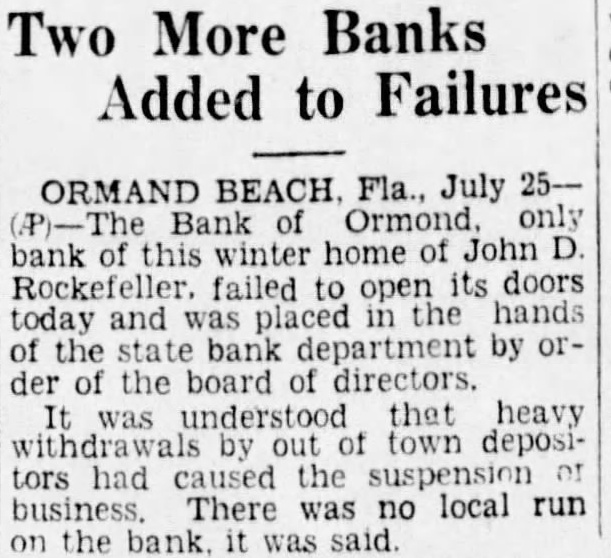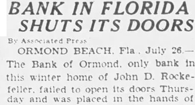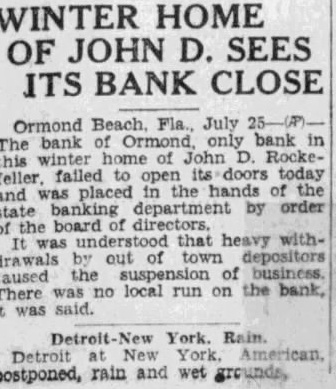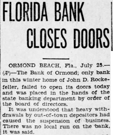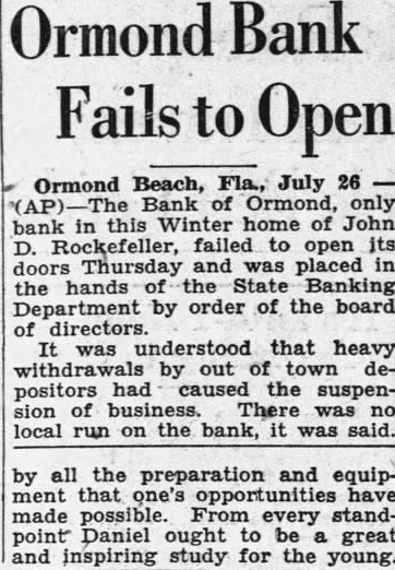 ORMOND BEACH, Fla., July (AP)-The Bank of Ormond; only bank in this winter home of John D. Rockefeller, failed to open its doors today and was placed in the hands of the state banking department by order of the board of directors. It was understood that heavy withdrawals by out-of-town depositors had caused the suspension of business. There was no local run on the bank, it was said