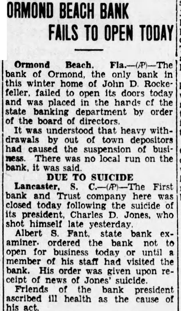 Ormond Beach. bank of Ormond, the only bank this winter home of John Rockefeller. failed open doors today and placed in the hands the state banking department by order the board directors. understood that heavy withdrawals out of town depositors had caused the of busiThere no local run on the DUE TO SUICIDE Lancaster, First bank and Trust company here was closed today following the suicide its president, Charles who shot himself late yesterday Albert Fant. state bank aminer. ordered the bank open for business today until member his staff had visited bank. order was given upon of news suicide. Friends the bank president ascribed health the cause his act.