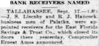 BANK RECEIVERS NAMED Sept. Lisenby Hancock business men of Palatka. were pointed for the East Florida Savings Trust which closed doors there Comptroller Ernest Amos announced