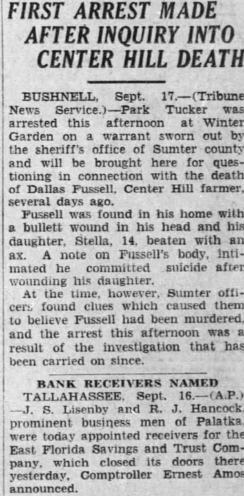 FIRST ARREST MADE AFTER INQUIRY INTO CENTER HILL DEATH Sept. News Tucker arrested this afternoon Winter Garden warrant sworn out the sheriff's office Sumter county and will brought here for questioning connection of Dallas Fussell, Center Hill farmer, Fussell found in his home with bullett wound in his head and his daughter, Stella, beaten with note Fussell's mated he suicide after his daughter. time, Sumter which caused to Fussell had been murdered. and the arrest this afternoon was result of the investigation that has been carried on since. BANK RECEIVERS NAMED Sept. Lisenby Hancock, prominent business of Palatka. today appointed receivers for the East Florida Savings and Trust Company. which closed there yesterday. Comptroller Ernest Amos announced.