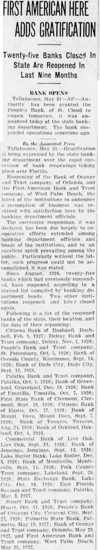 FIRST AMERICAN HERE ADDS GRATIFICATION Twenty-five Banks Closed In State Are Reopened In Last Nine Months BANK OPENS May thority has been granted the People's Bank, St. Cloud to reopen was announced today the state banking department. The bank pended operations sometime ago. By the Associated Press May by the state banking the rapid succession of bank reopenings taking Reopening of the Bank of Orange Trust and the American Bank and of West Palm the latest of the institutions announce resumption of business satisfaction here by the department officials. The was declared. has due largely operative efforts extended among banking department officials and heads the institutions, and excellent prevailing among the public Particularly the latter, such progress could not be accomplished, was stated. Since banks had have reopened. according to revised list compiled by banking department heads. Two other institutions and later closed Following list of the reopened banks of the state, their location. and the date their repoening: Citizens Bank of Bushnell, Bushnell, Feb. 1927 Delray Bank and Bank and St. Oct. Bank County Sept. 14. Bank Dade City, Dade City, Palatka Bank and Trust company, Palatka, Bank GroveDec. Bank of Umatilla, Umatilla, 1926: First State Bank Clermont, ClerSept 28, 1926 Citizens Bank Eustis, Oct. 1926: Bank Mount Dora, Mount Dora, Sept. 1926: Bank of Aug. 24, 1926 Bank of OakOct. Bank of Live Oak. Live Oak, Sept. Bank Sept. 13, 1926 Lake Butler, Dec. Bank of Monticello, 14, 1926: Polk County Trust Lakeland. 28, State Bank. Lake 1926: East Florida Stuart Bank and Trust company. Stuart, Oct. 1926: People's Bank Sept 1926: Palmetto State Bank. Palmetto, May 19. 1927: Bank Orange and Trust company. Orlando, May 23. 1927, and First American Bank and Trust company. West Palm Beach, May