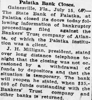 The State Bank of Palatka closed temporarily on July 15, 1926 after bankruptcy proceedings against its correspondent/fiscal agent Bankers' Trust of Atlanta. Newspaper states closing was not due to depositor withdrawals and that the bank would reopen when $35,000 outstanding with Bankers' Trust and other banks is returned.