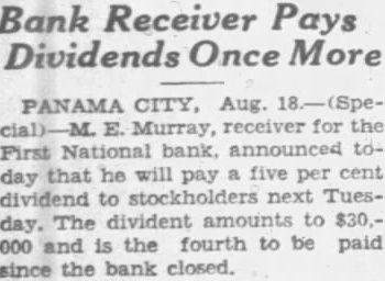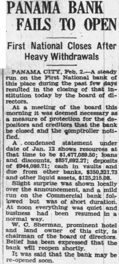 PANAMA BANK FAILS TO OPEN First National Closes After Heavy Withdrawals PANAMA CITY, Feb. 2.-A steady run on the First National bank of this place during the past few days resulted in the closing of that institution today by the board of directors. At a meeting of the board this morning it as a measure of protection for the depositors and creditors that the bank be closed and the comptroller notified. condensed statement under date of Jan. 12 shows resources at that time to loans and discounts, $857,692.27; deposits of $944,086.71; cash in vaults and due from other banks, $350,321.7 and other liquid assets, $125,215.08. Slight surprise was shown locally over the announcement, and mild run on the Commercial bank followed but was of short duration. At noon everything was quiet and business had been resumed in normal way. W. Sherman, prominent hotel and land owner of this city, is chairman of the board of directors. Belief has been expressed that the bank will reopen shortly It was said that the bank may be re-opened soon.